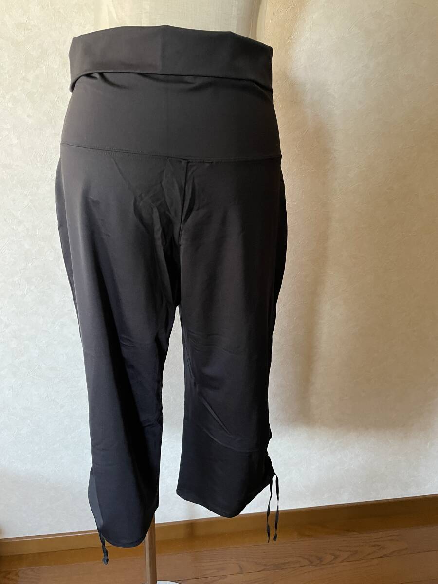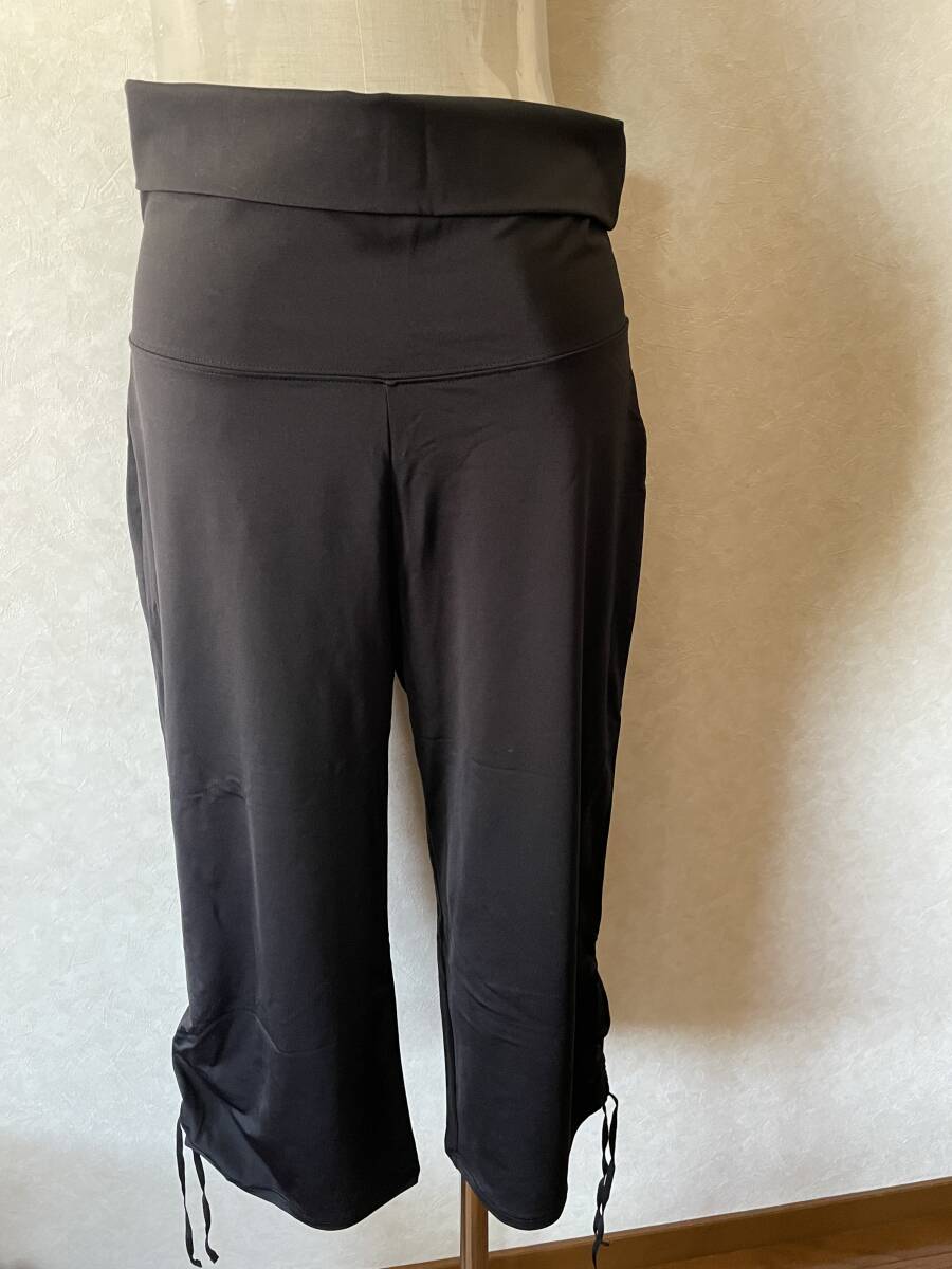 ・ヨガパンツはユニクロで購入しました。サイズはLです。表記にウエスト69cm〜75cmとあります。平置きで、ウエスト38cm、ヒップ49.5cm、総丈(ウエスト伸ばした状態)86cm、股下49cmです。素人採寸であることを御考慮ください。ウエストは折り返しができます。パンツの裾上部に紐があり長さが調節できます。素材はポリエステル87%、ポリウレタン13%です。