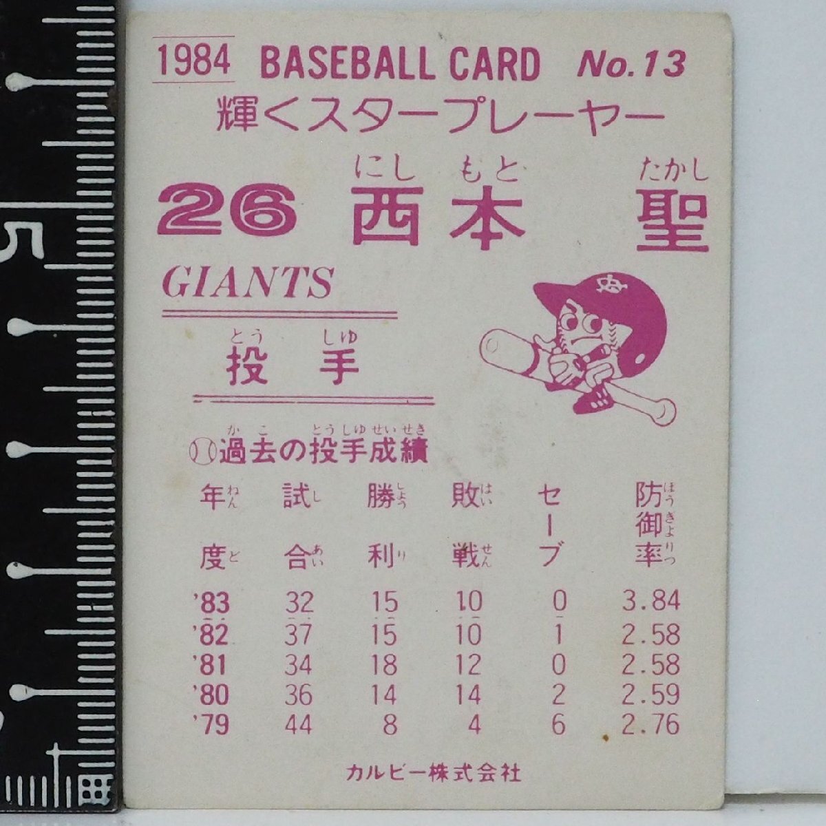 84年 カルビー プロ野球カード No.13【輝くスタープレーヤー 西本 聖 投手 読売ジャイアンツ巨人】昭和59年 1984年 当時物 おまけ食玩 中古