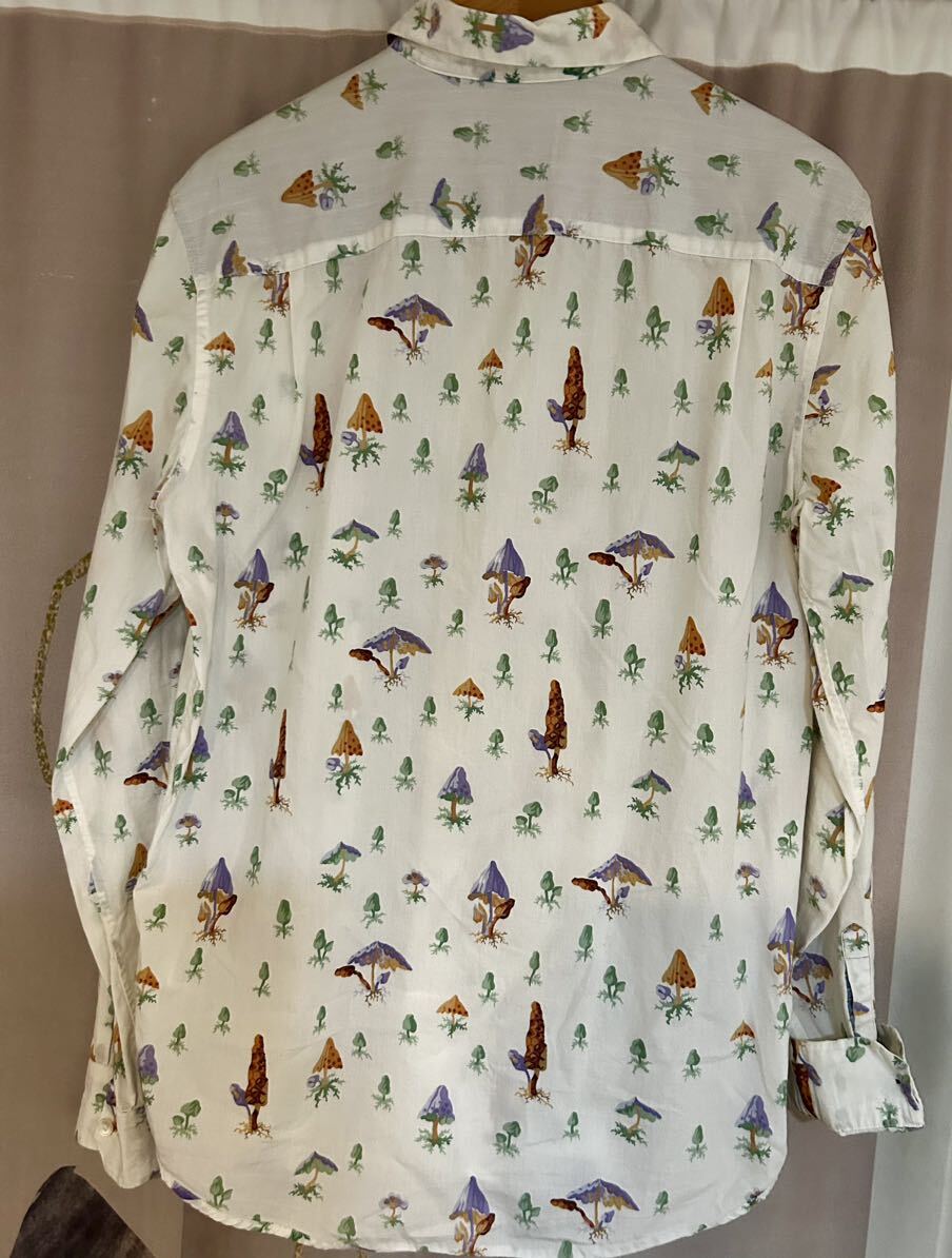 第一ボタンと最後のボタン、そして袖口のボタンもキノコっぽさを催した茶色いボタンが取り付けられておりキノコ好きにはたまらない一枚となります。