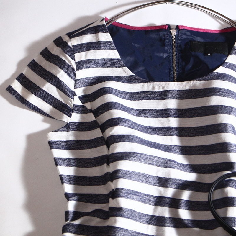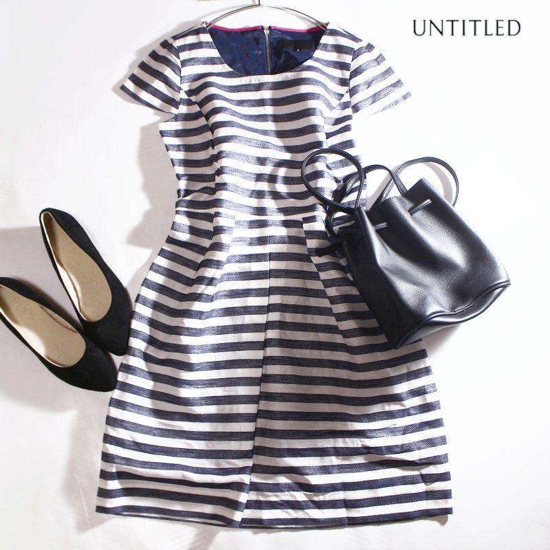 美品 アンタイトル UNTITLED 株) ワールド 夏 麻 ボーダー柄 半袖 ワンピース 小さいサイズ 0 5号 マリン ネイビー 紺 ホワイト 白 可愛い
