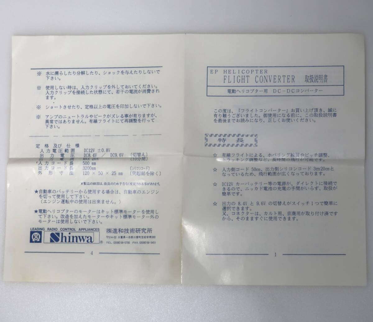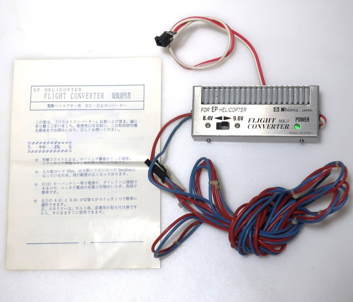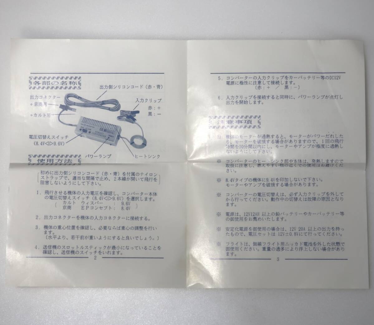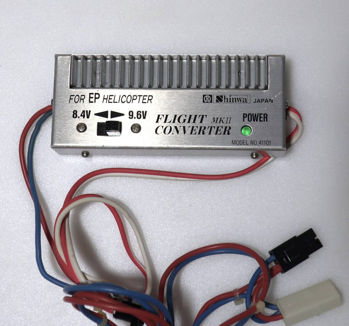長期保管の品です。 微かに擦り傷・汚れありますが、状態は良く綺麗です。 以前は動作していましたが環境が無く未確認です。 電動ヘリで、動力電源を外部電源により有線で供給し 飛行させるために使用するDC-DCコンバーターです。 ※ 入力側はプラグジャック式に変更してあります。 入力 DC12V 出力 DC8.4V / DC9.6V 切替 出力電流 MAX20A 入力コード長 500mm 出力コード長 3200mm | |
