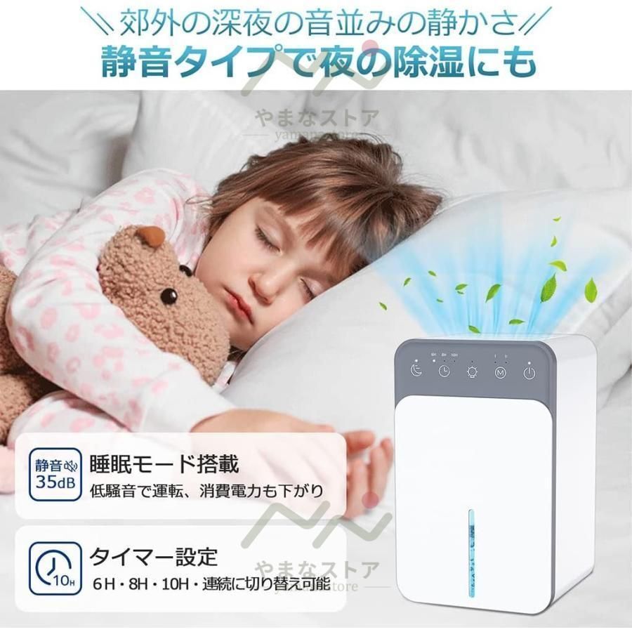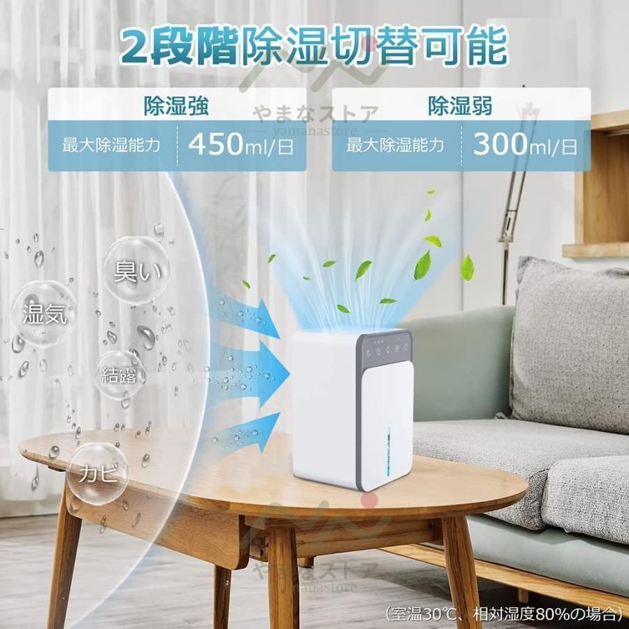 【3つのモード切替除湿機】 除湿機 コンパクトで最先端の半導体凝縮技術を採用しており、空気中に浮遊している水分子を素早く凝縮させ、効果的に除湿することができます。定格除湿能力は、室温30℃、相対湿度80%の条件下で1日に400-450mlの水分を除湿できます。じょしつき 小型、使用する部屋や場所によって「除湿強」または「除湿弱」のモードに切り替えることができます。電源ボタンをタッチすると、「除湿強」が自動的に運転します。モード切替ボタンを押すと、「除湿強」と「除湿弱」のモードを切り替えることができます。