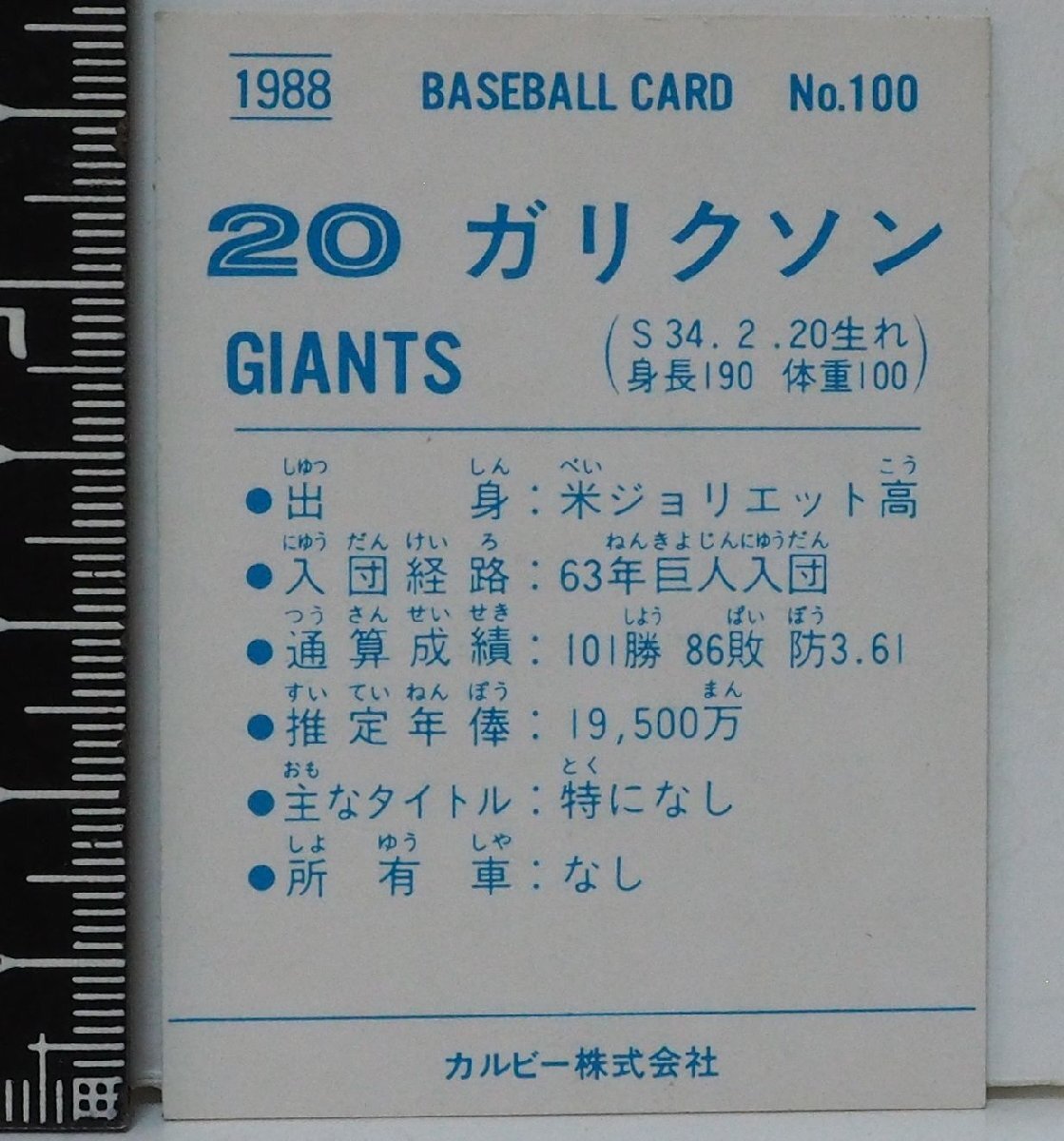 88年 カルビー プロ野球カード No.100【ガリクソン 読売ジャイアンツ巨人】昭和63年 1988年 当時物Calbeeおまけ食玩BASEBALL【中古】送料込