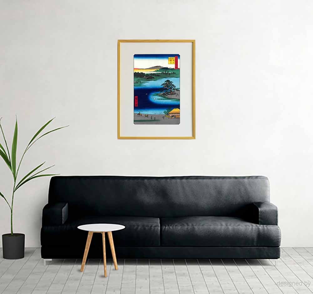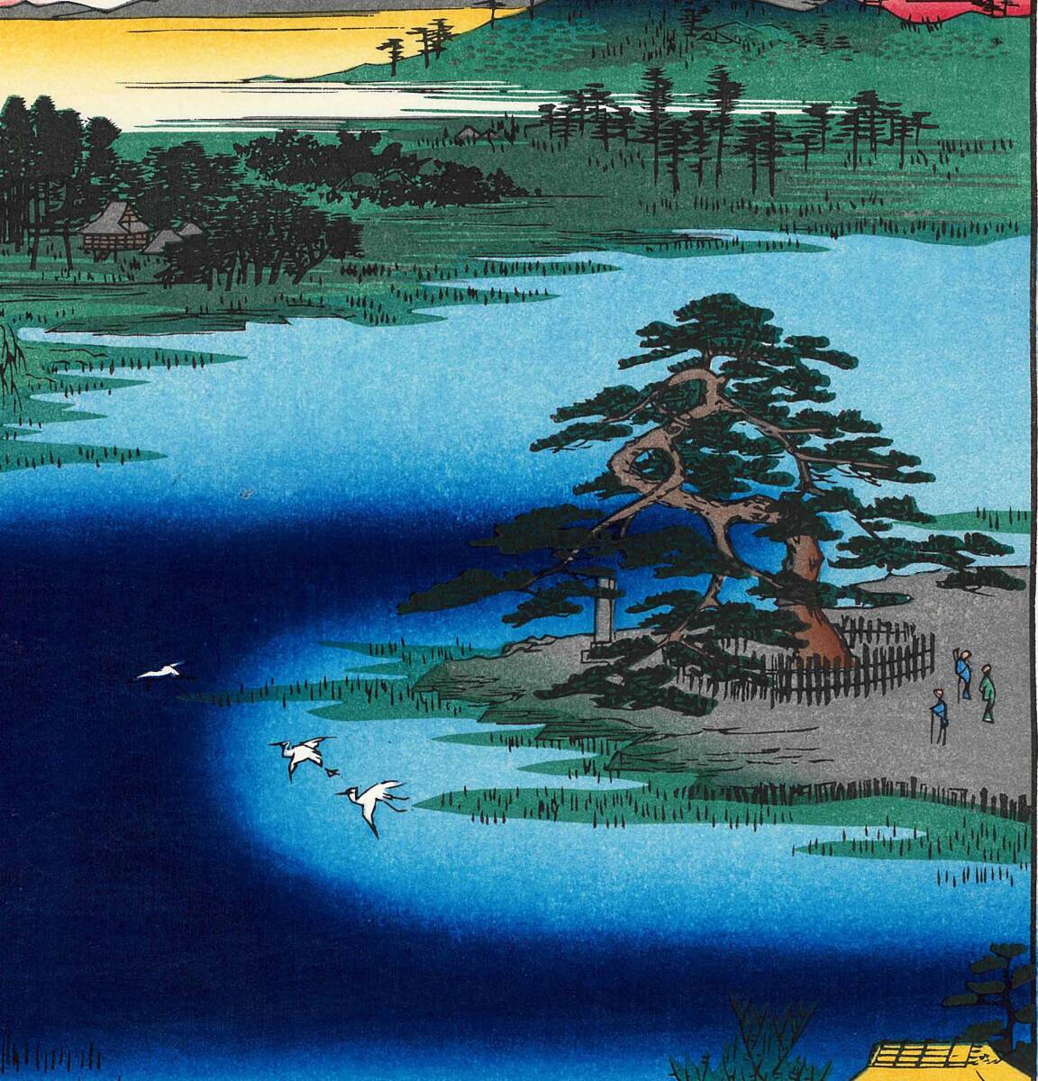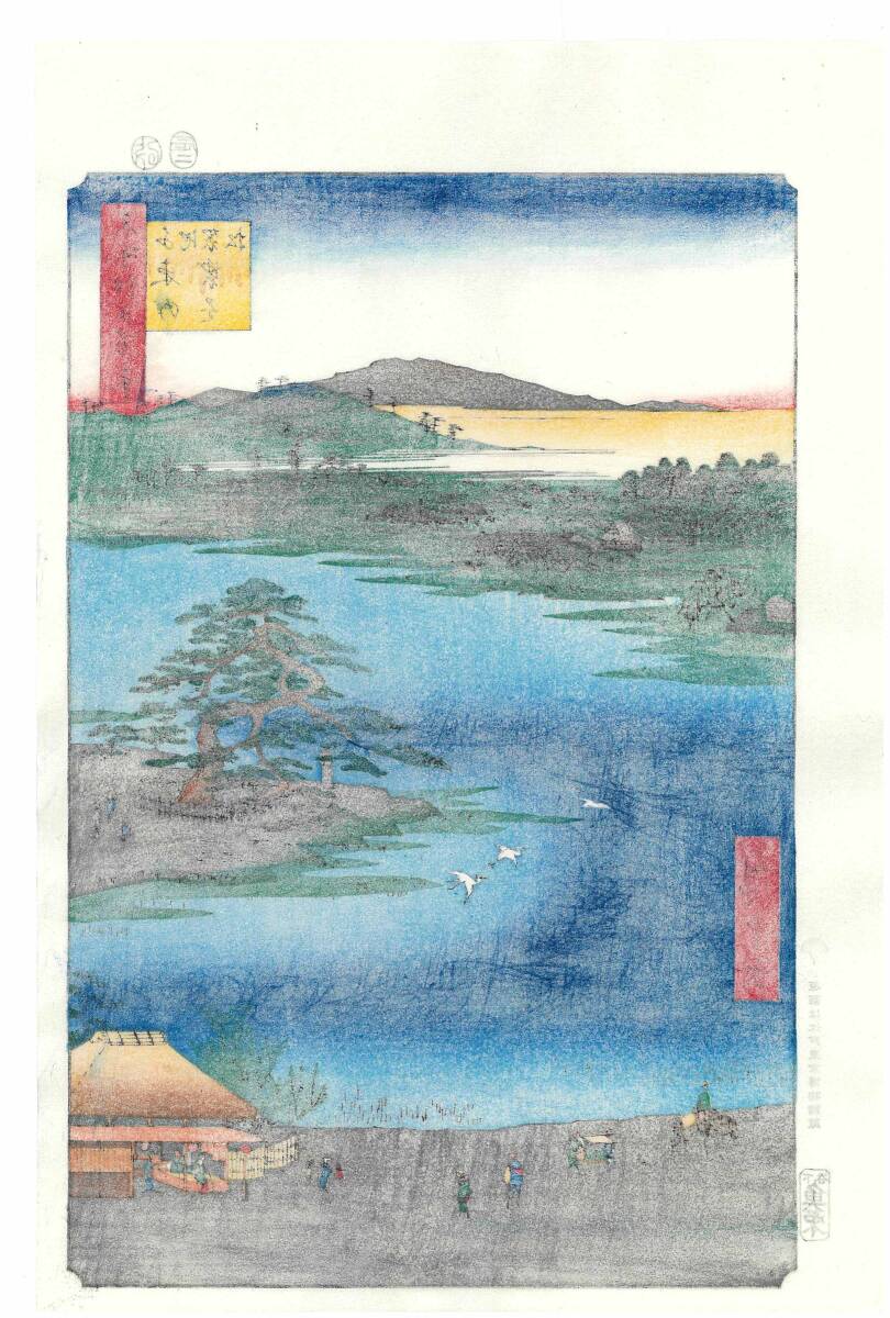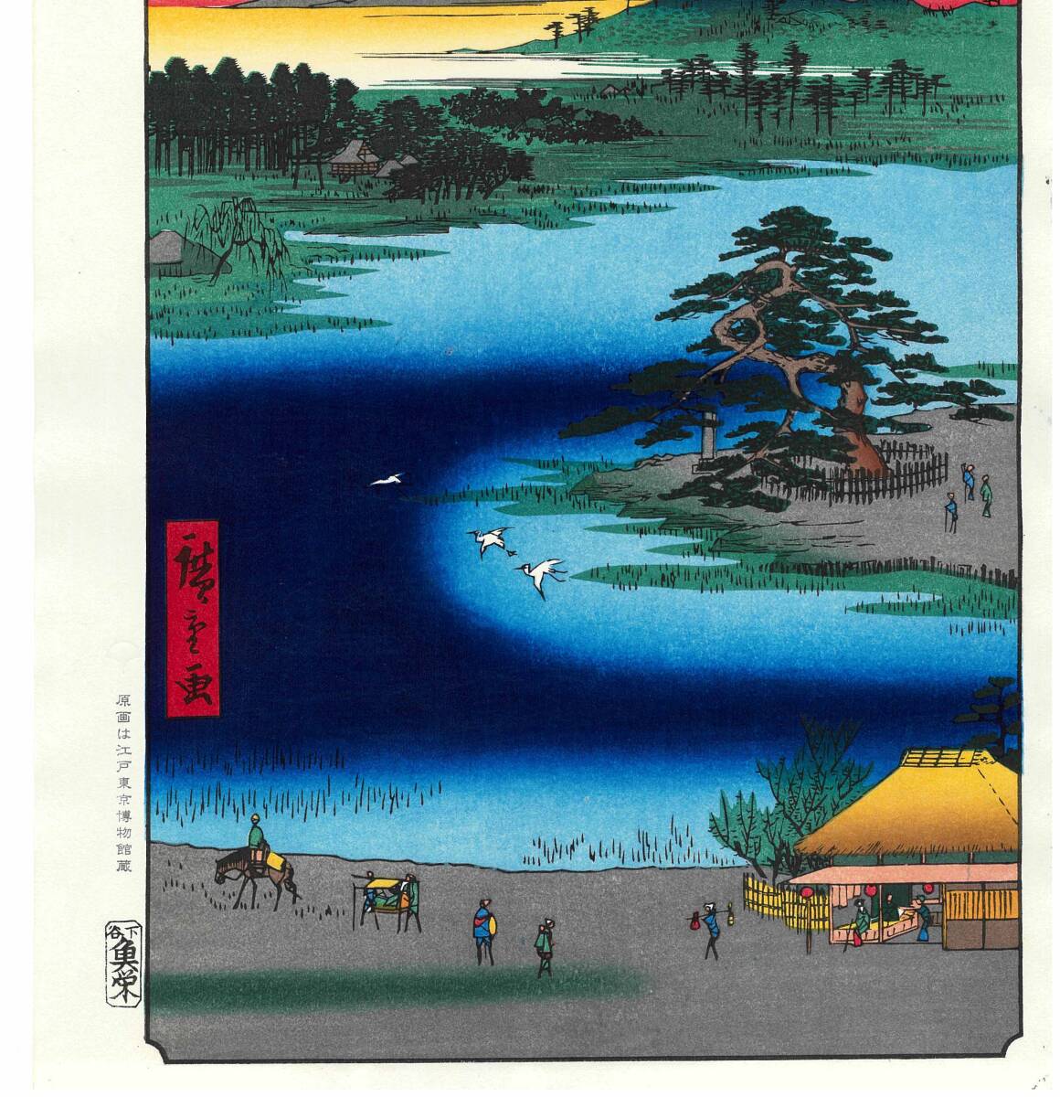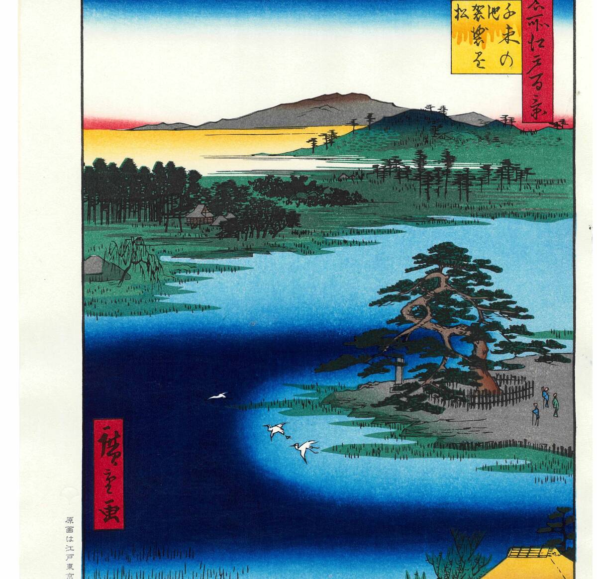真作保証 東京都伝統工芸品 額装  歌川広重  木版画  #110 千束の池袈裟懸松 初版1856-58年頃    広重の世界を唸らせた名構図!