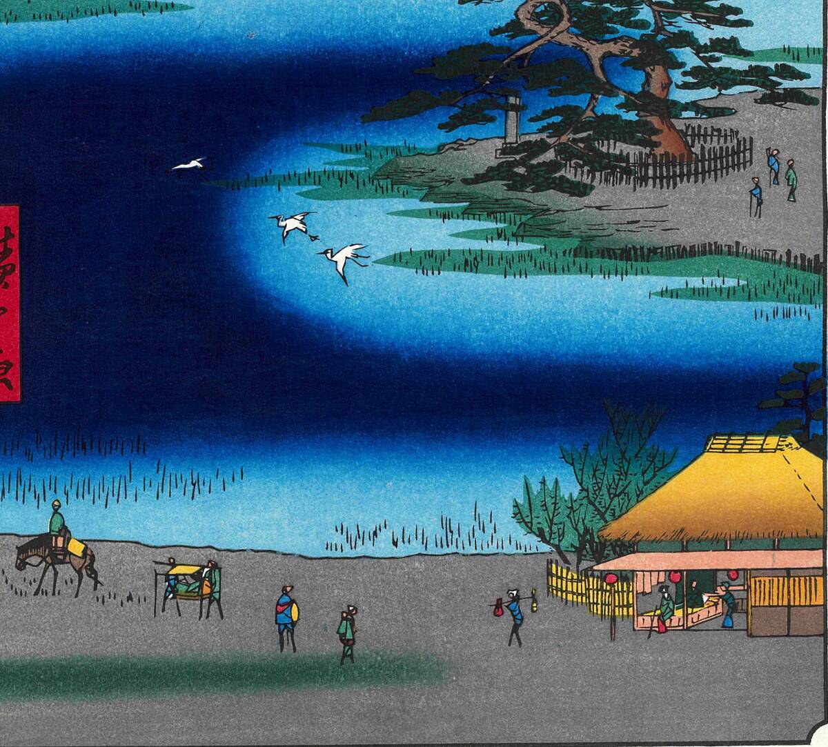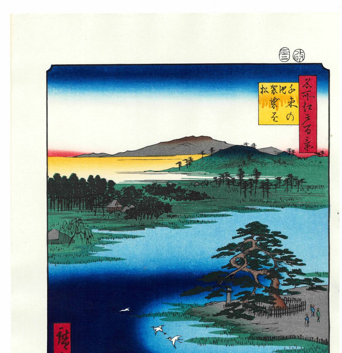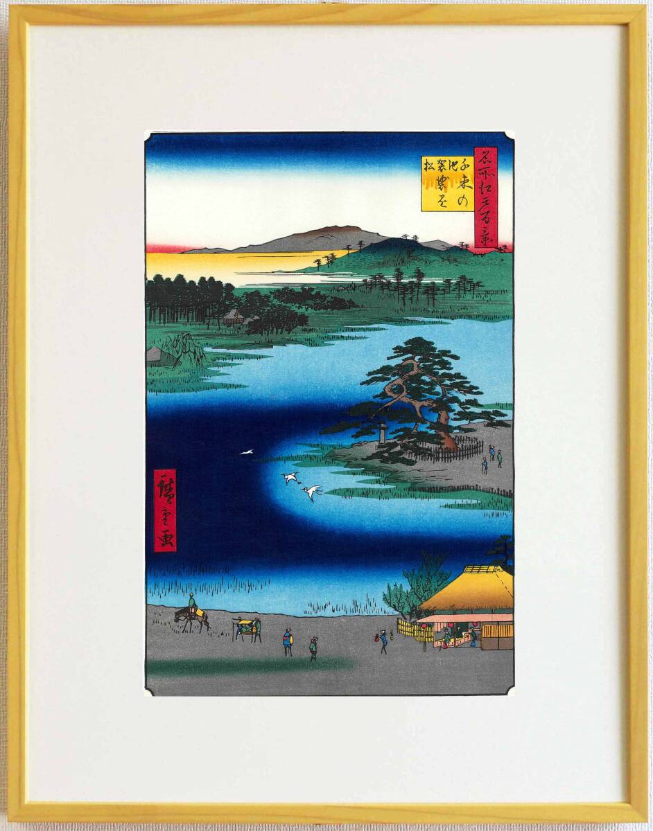 真作保証 東京都伝統工芸品 額装  歌川広重  木版画  #110 千束の池袈裟懸松 初版1856-58年頃     広重の世界を唸らせた名構図!