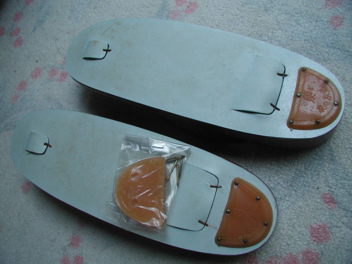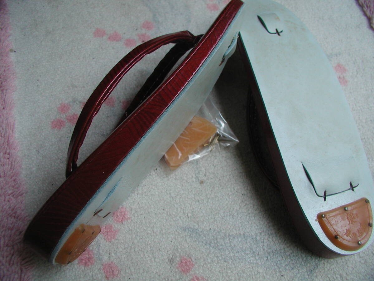 未使用ですが、長期保存のため裏が汚れのように見えます。 皮だと思いますが、詳しくはわかりません。 かかとが傷むため、かかとの替えパーツもついています。