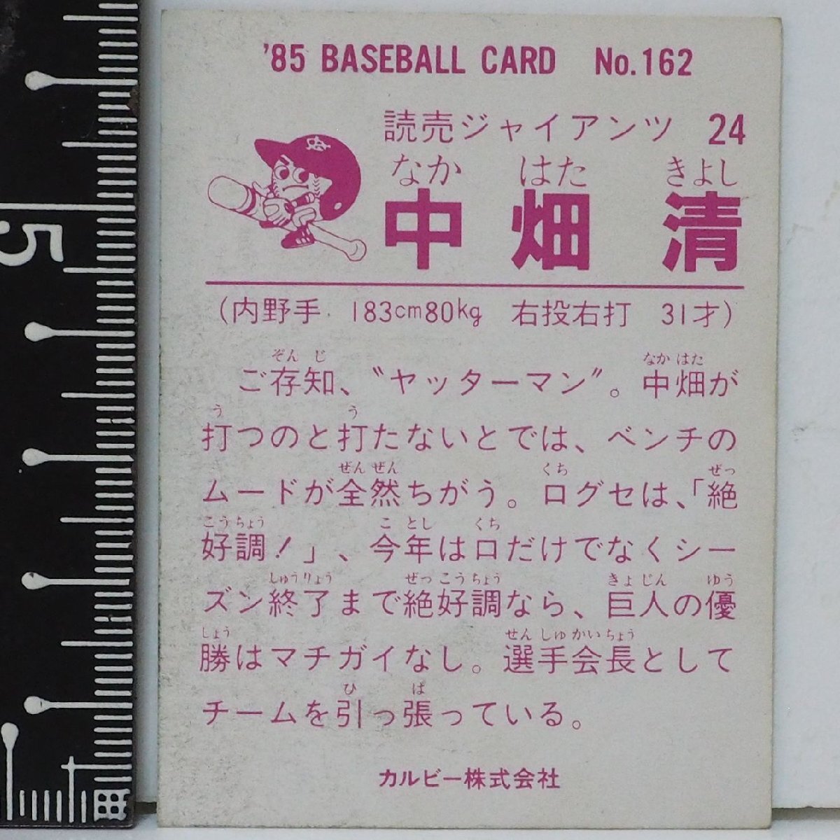 85年 カルビー プロ野球カード No.162【中畑 清 内野手 読売ジャイアンツ巨人】昭和60年 1985年 当時物 Calbee おまけ 食玩 BASEBALL 中古