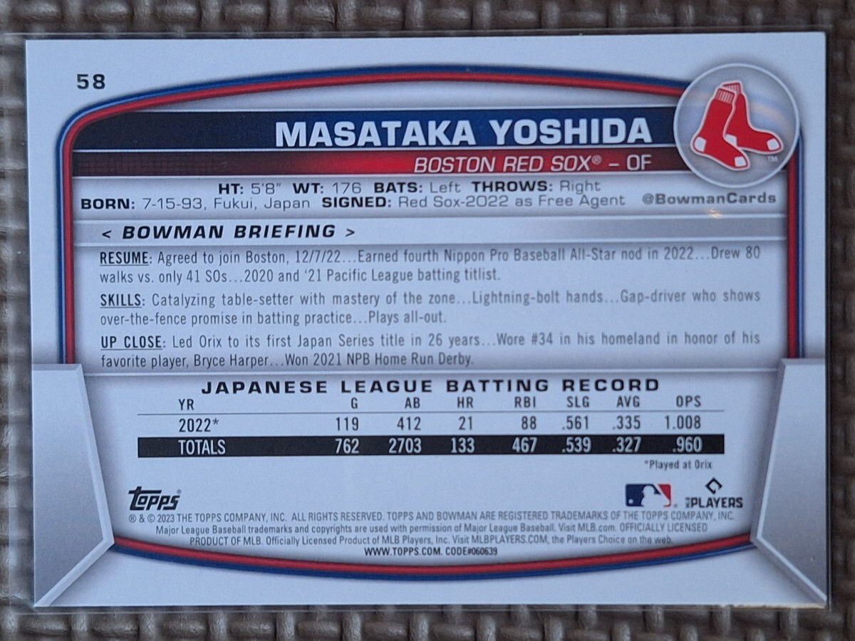 2023 Bowman #58 MASATAKA YOSHIDA RC Boston Red Sox Orix Buffaloes