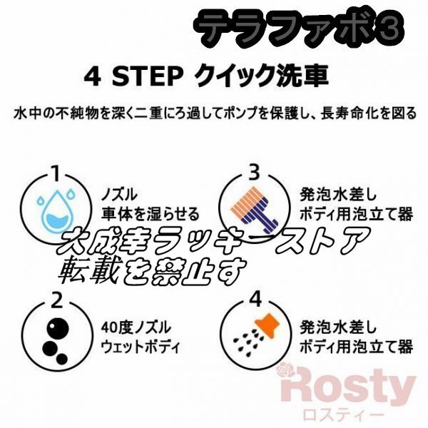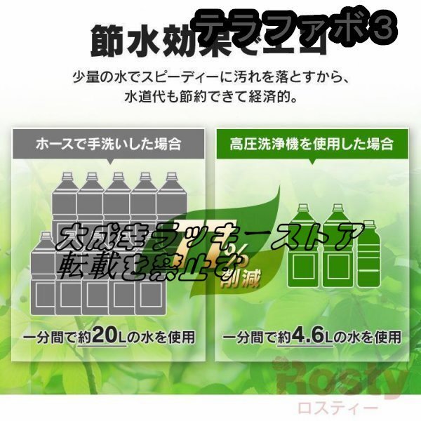 【アップグレードされた多機能ノズル】多機能洗車高圧ガンの特別に設計された多機能ノズルは、ノズルの先端を回すだけで「ガンコな汚れを落としたい」「庭のお花に水をあげたい」など適切な噴射モード(直噴、20度拡散、40度扇状拡散、泡噴射)に切り替えて使用できます。角度調整可能なノズルは、タイヤなどの手の届きにくいコーナーの清掃に適した、任意の角度で水を噴霧できます。※高圧洗浄機ガンに付属のフォームポットに洗剤を入れてノズルを合わせるだけで、高圧の水で洗剤を泡立てます。また、噴射の角度が調整できるノズル、車の屋根の上や底部など手が届かないところも立ったままでしっかり簡単に洗浄します。
