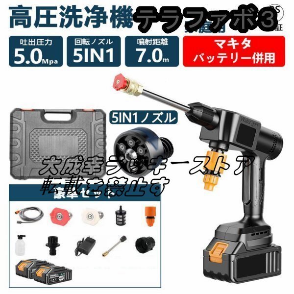 【高性能ハイパワー】高圧洗浄機のガンと本体が一体化した使い勝手の良いハンディウォッシャー。吐出圧力5.0Mpaのパワフルな高圧噴射で、ガンコな汚れを洗い流す高圧洗浄機です。家庭用洗浄機は高性能なパワーモーターを搭載して、水を素早く吸入・加圧して噴射します。多機能洗車ガンセット内容:本体、充電器、リチウムイオン充電バッテリー*2、回転ノズル、方向調整ノズル、フォームポット、フィルター付き専用給水管(5m)、ペットボトル用給水コネクター、収納箱.(ご注意:この商品はマキタブランドの製品ではありませんが、マキタバッテリーを使用することができます。)