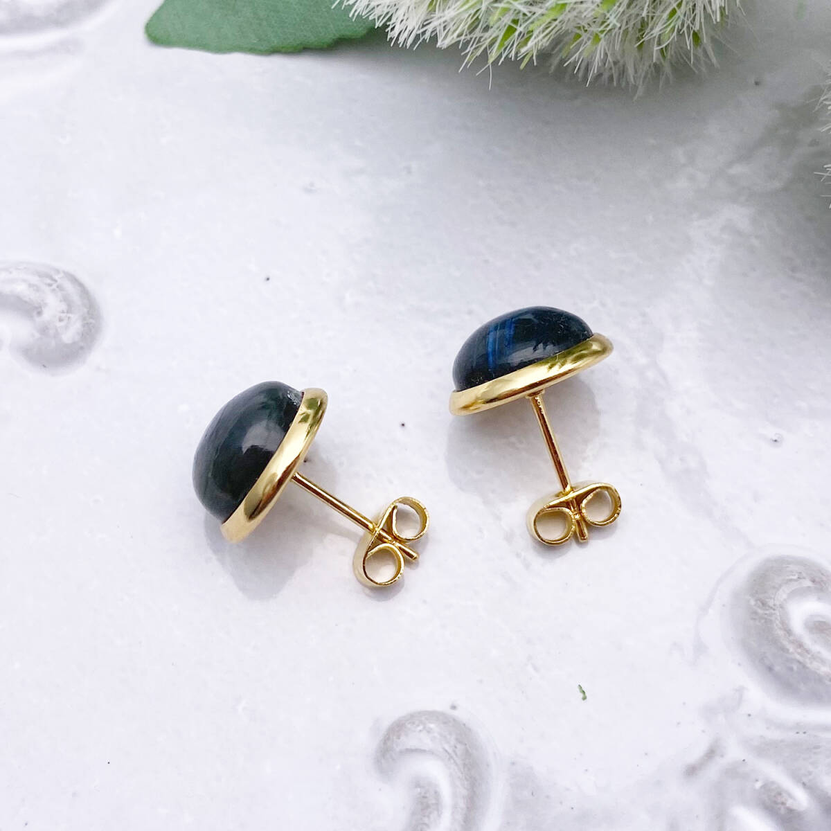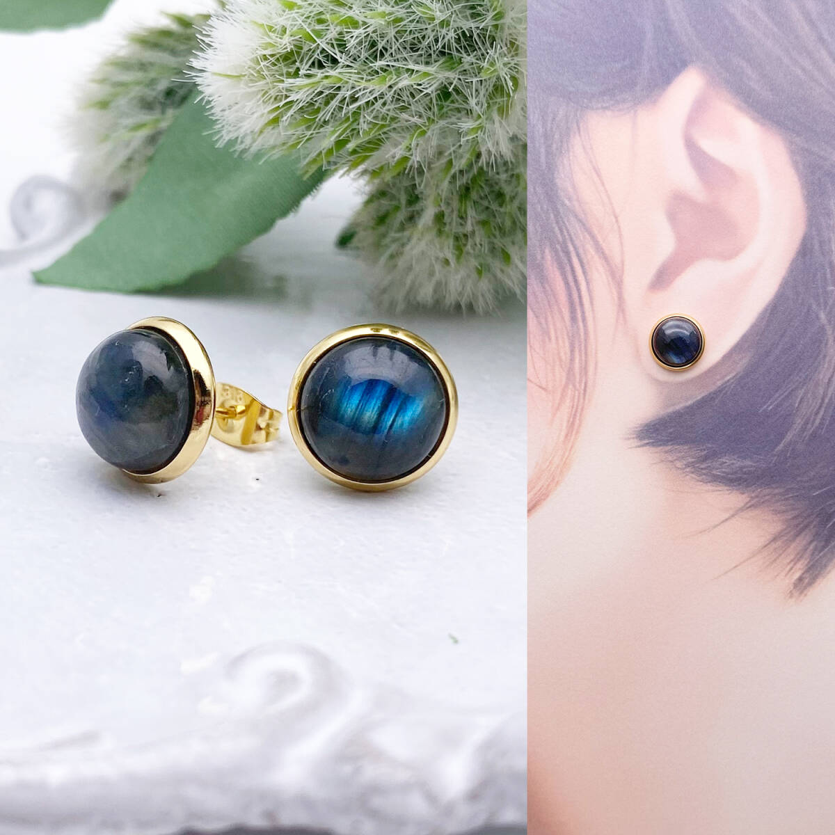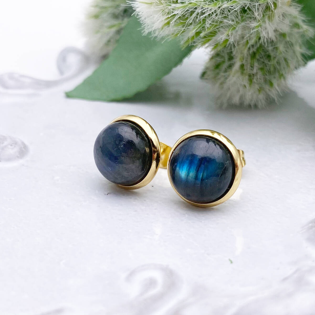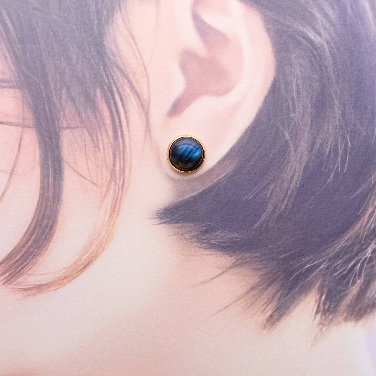 【宝石質】ブラックラブラドライトカボション10mmスタッドピアス/24kgp/天然石・パワーストーン/ハンドメイド
