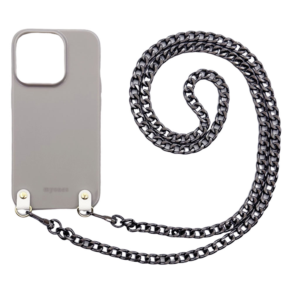 iPhone14 Pro(くすみグレー/ブラックA)チェーン ソフトケース スマホショルダー 肩掛け 首かけ 斜めがけ かわいい 韓国