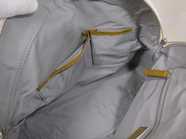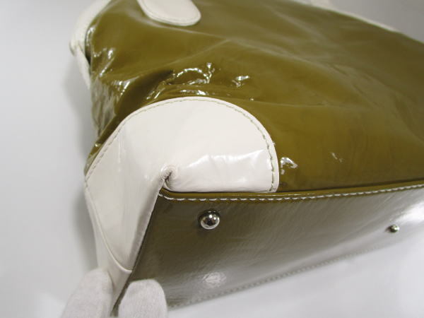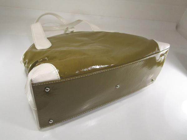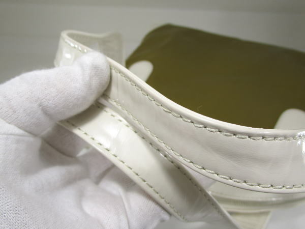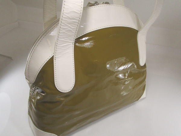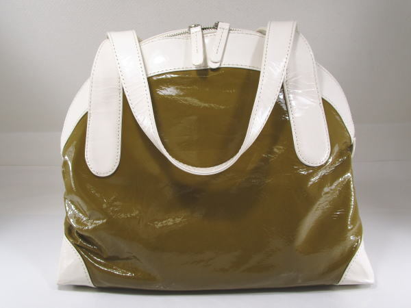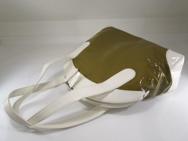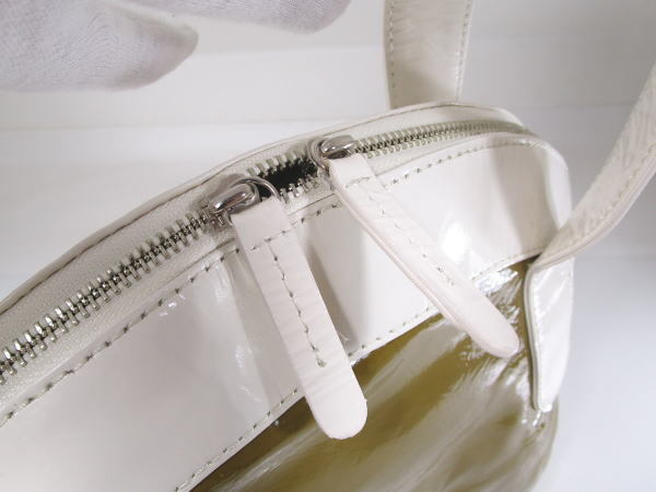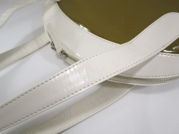 | コメント | エナメル素材を使用したバッグでコロンとしたフォルムが可愛いデザインです。内側にポケット2、ファスナーポケット1です。 小傷、若干の型崩れはございますが使用の少ないきれいな商品です。 |