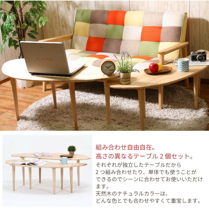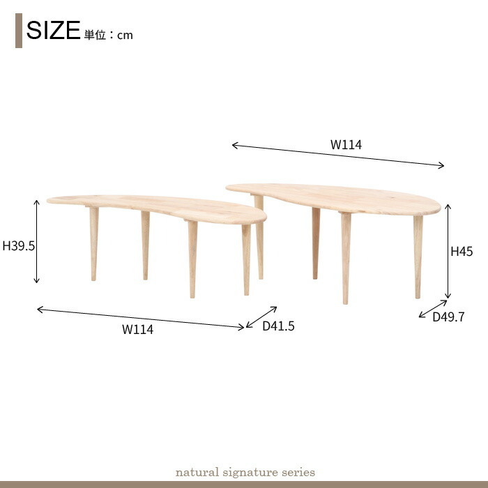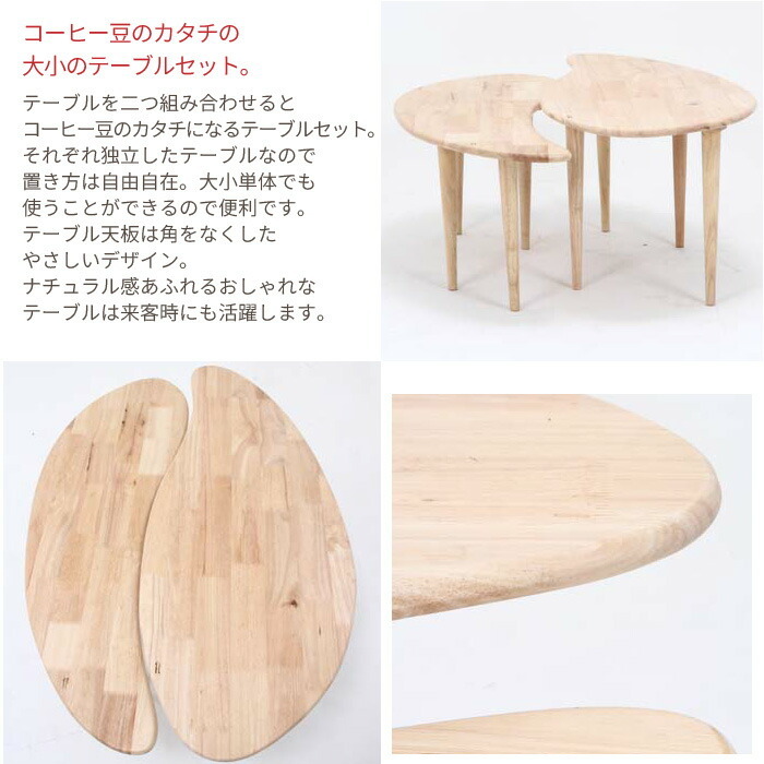 組み合わせて使ったり、別々にも使えるコーヒー豆のカタチでユニークなセンターテーブル。 天然木の質感をそのまま生かしたナチュラルシグニチャーシリーズ。 自然な色合い、木目でどんなインテリアにも馴染みます。 テーブルを二つ組み合わせるとコーヒー豆の形になるテーブルセット。 それぞれ独立したテーブルなので、置き方は自由自在。 シーンに合わせてお使いいただけます。 天板は角をなくしたやさしいデザイン。 |