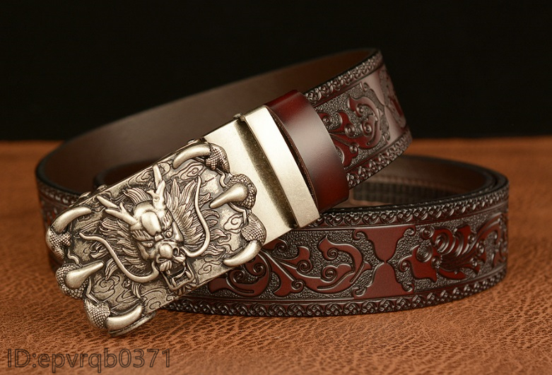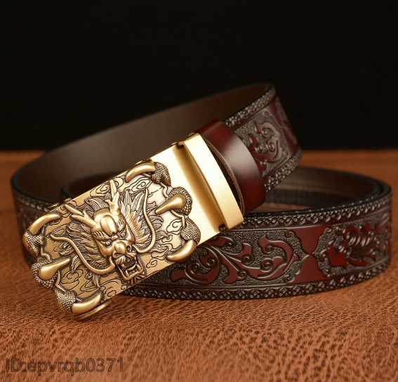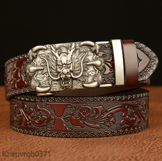 レザーベルト 新品 オートロック式 バックル ドラゴン 本革 メンズ ベル ト 幅3.5センチ 紳士 長さ調整可能 2色選ぶ/シルバー