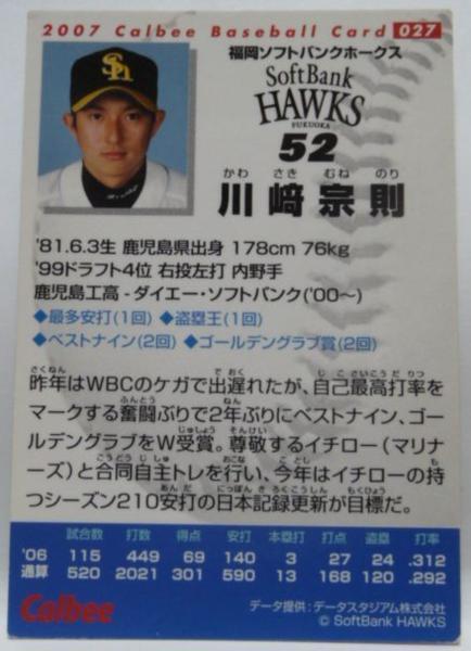 カルビープロ野球カード2007年#027【川崎 宗則(福岡ソフトバンク ホークス)】平成19年チップスおまけ食玩トレーディングカード(中古)送料込