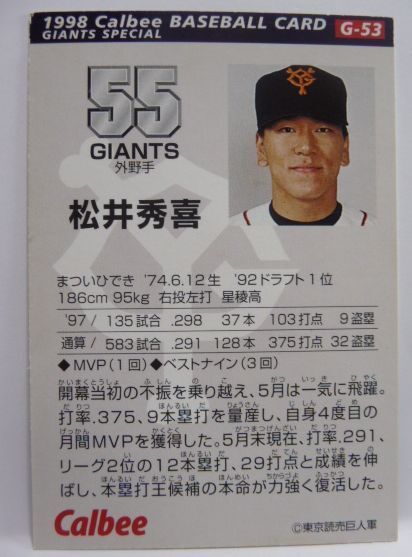 カルビープロ野球カード98年GIANTS SPECIAL G-53【松井 秀喜(東京 読売ジャイアンツ巨人)G】平成10年1998年チップスおまけ食玩(中古)送料込