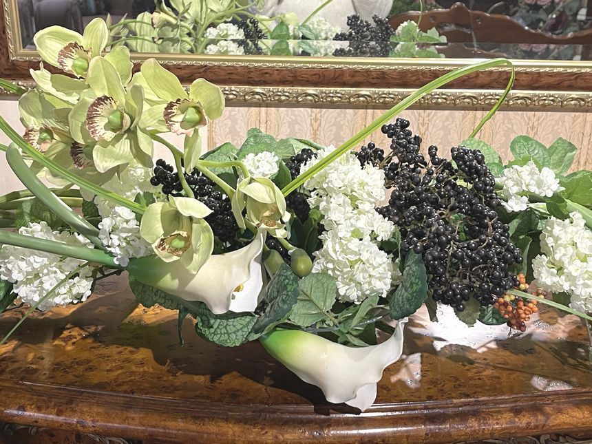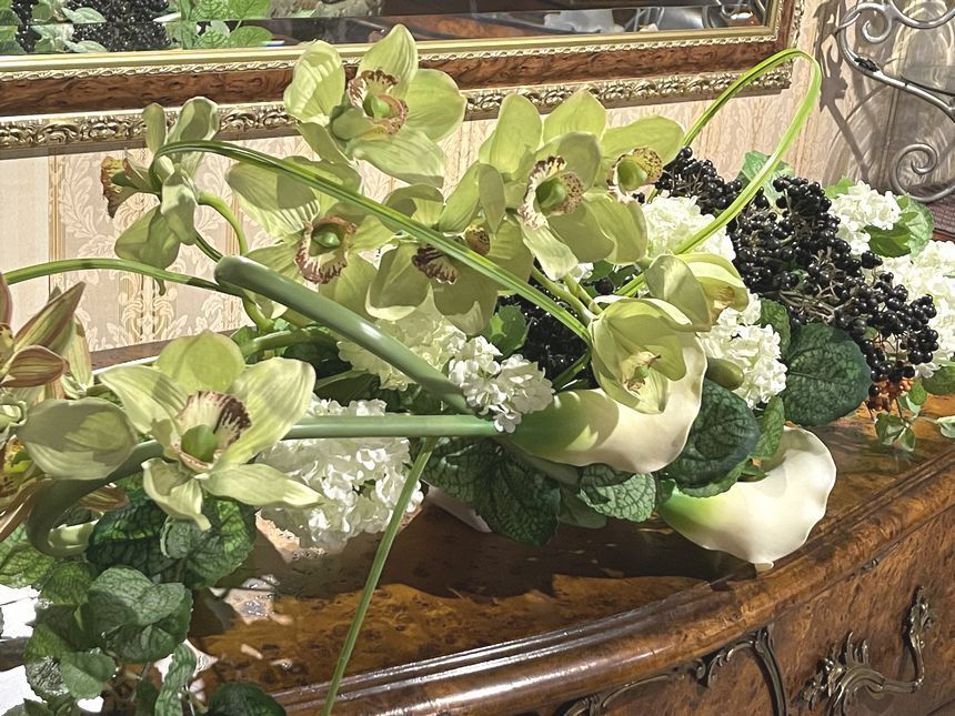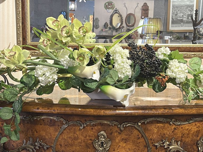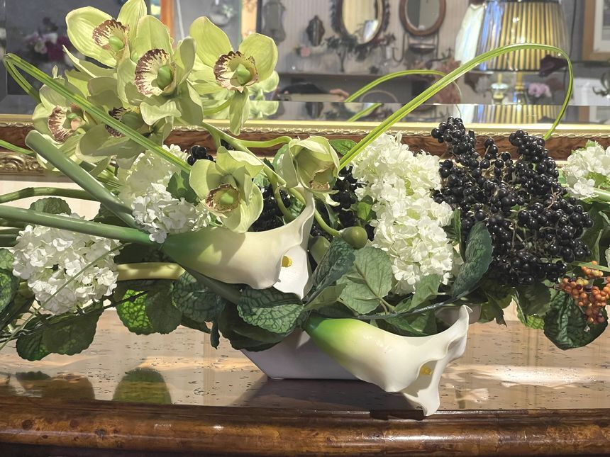 *新品*アルテ・デ・ラ・フロール*アレンジフラワー*カラー*蘭*エレガント*グリーン*アンティークホワイト*造花*ゴージャス*