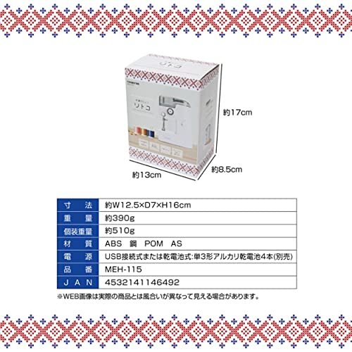 ・白 MEH-115・寸法 約W12.5×D7×H16cm. 重量 約390g. 個装重量 約510g. 材質 ABS 鋼 POM AS. 電源 USB接続式または乾電池式:単3形アルカリ乾電池4本(別売).・特徴:ちょっとしたお直し等にサッとだしてすぐ使えます。チェーンステッチ縫いでしっかり縫えます。すぐに始められるフルセット。・電源方式:USB接続式/乾電池式 2WAY式、便利な2way。電池でコードレスとして便利。USBでパワフルにソーイングもOK。・コンパクト設計:手のひらに乗るほどの超コンパクト設計。収納便利、ふきん・雑巾・裾上げなど、まずはちょっと縫いたい初心者にぴったり。・付属:糸通し簡単×1、USBコード×1、予備ミシン針×1、ねじドライバー×1、ボビン×3(白糸付き2、黒糸付き1)寸法 約W12.5×D7×H16cm. 重量 約390g. 個装重量 約510g. 材質 ABS 鋼 POM AS. 電源 USB接続式または乾電池式:単3形アルカリ乾電池4本(別売). ●ちょっとしたお直し等にサッとだしてすぐ使えます USB接続式/乾電池式 2WAY式 コンパクト設計