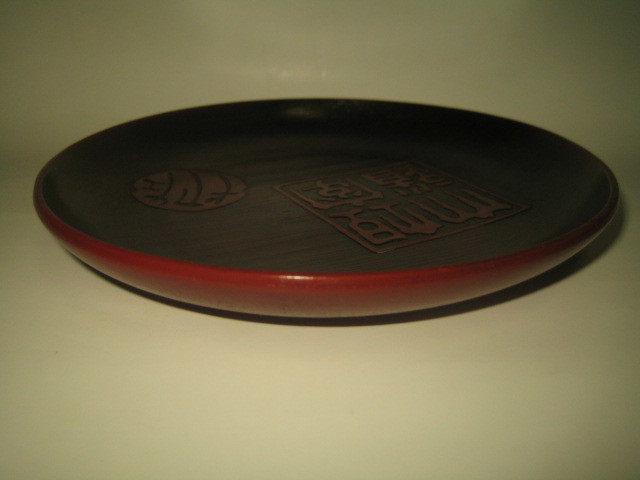 古代朱色の漆で盛り上がっており、立体感をもって引き立ちます。字は皿ごとに微妙に