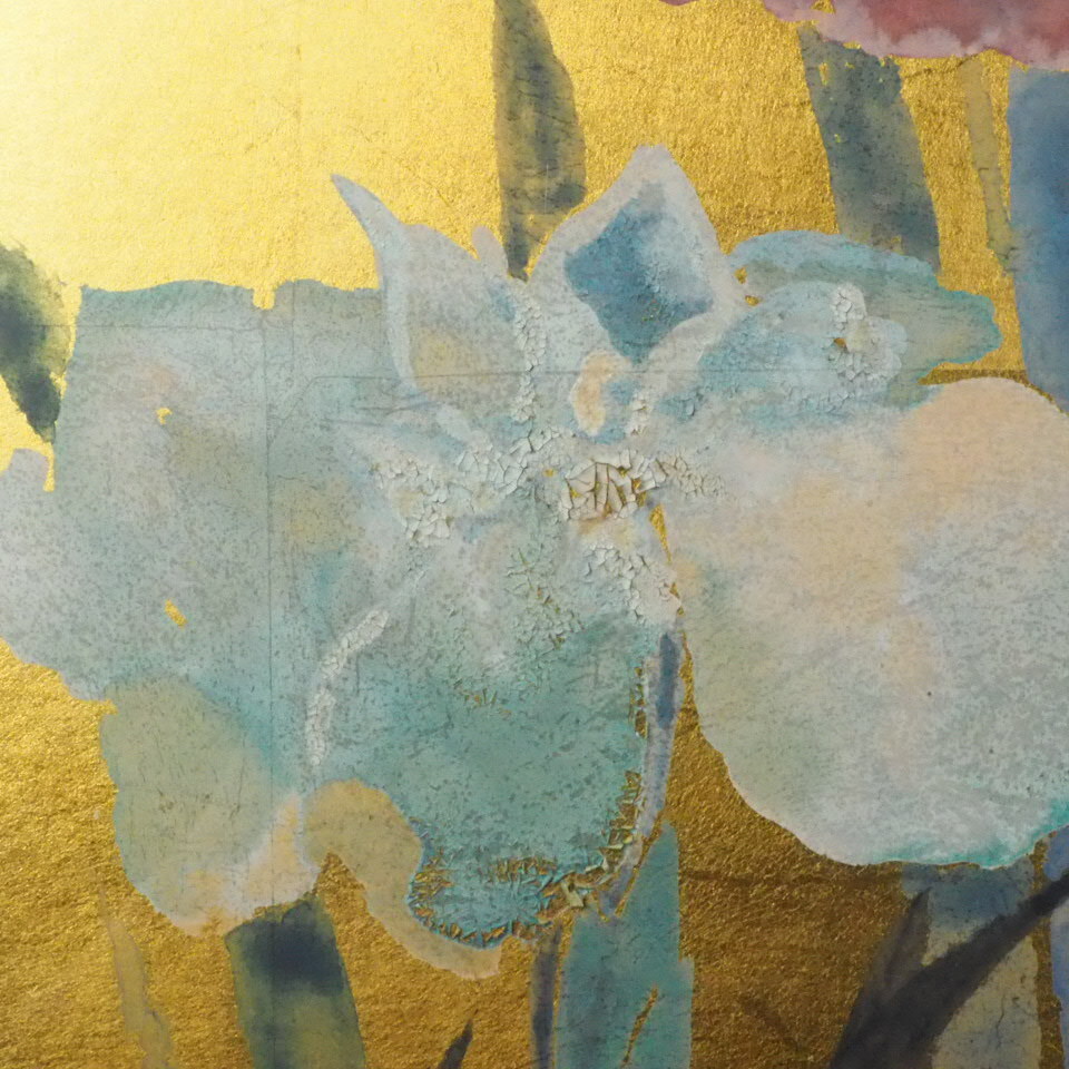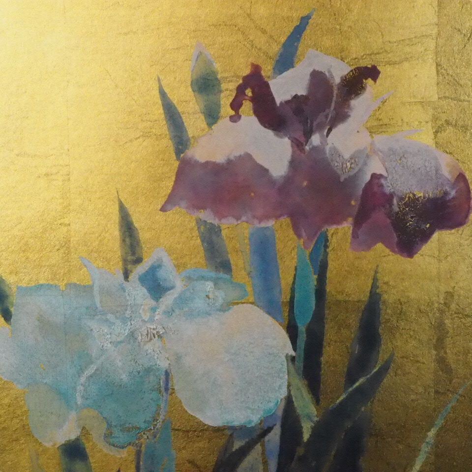 色紙絵 水彩画 今井敏子作「花 菖蒲」サイン有 金箔貼り絵 額装品