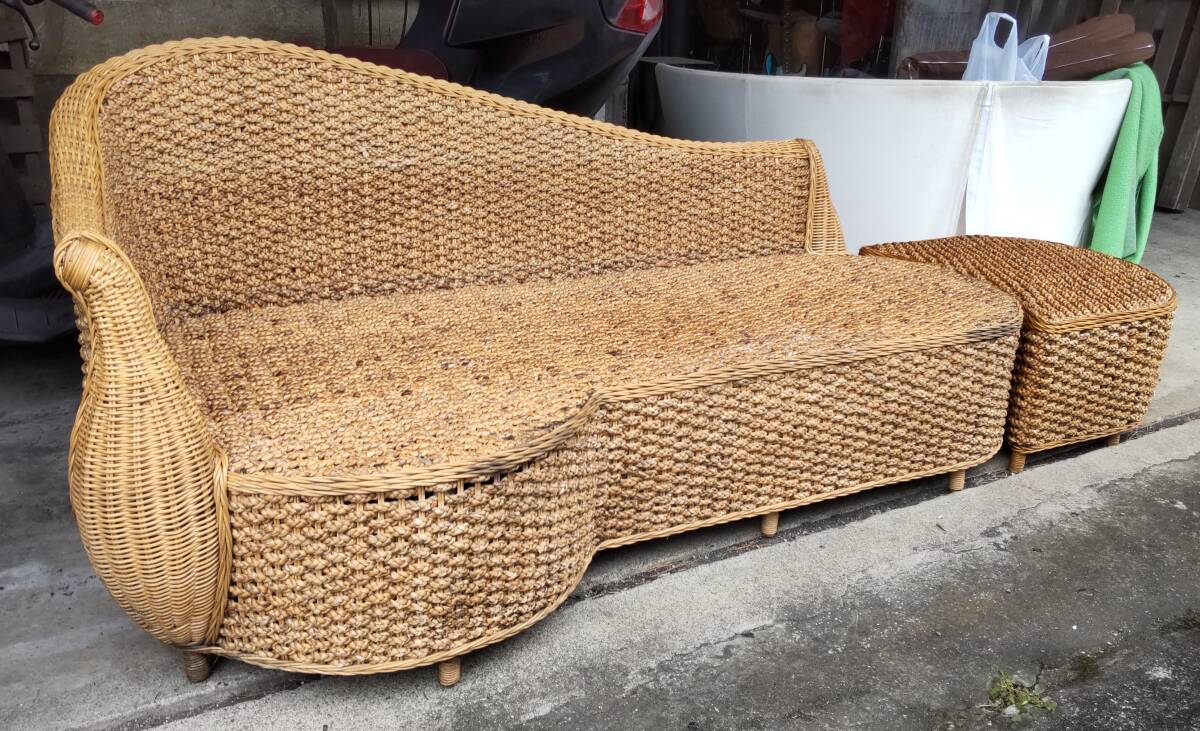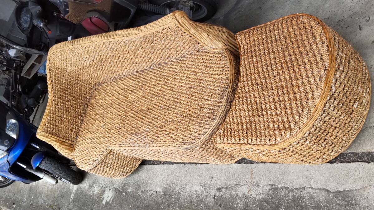 あまり見かけない形で、いいデザインだと思います。クッションも付属していますが、チープな感じなので、クッションなしで使う、別の小ぶりなクッションを並べる、又、お好みのスタイルのカバーの新調もお勧めです。家財宅急便対応致しますが、引取が良いかと。サイズは後ほどアップ致します。