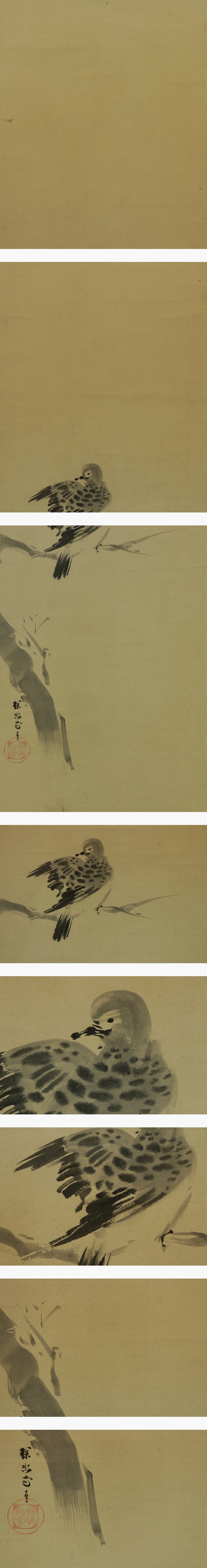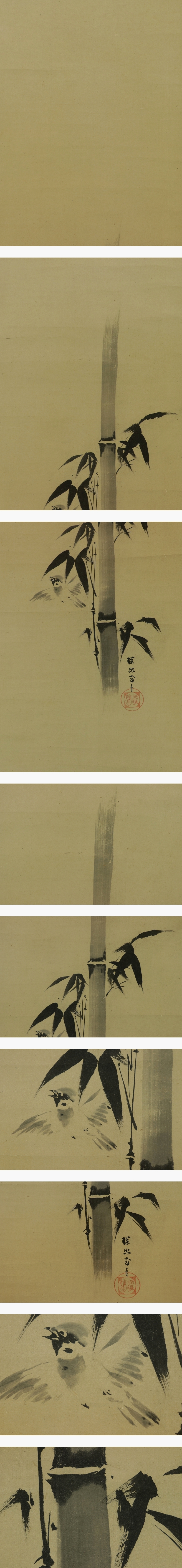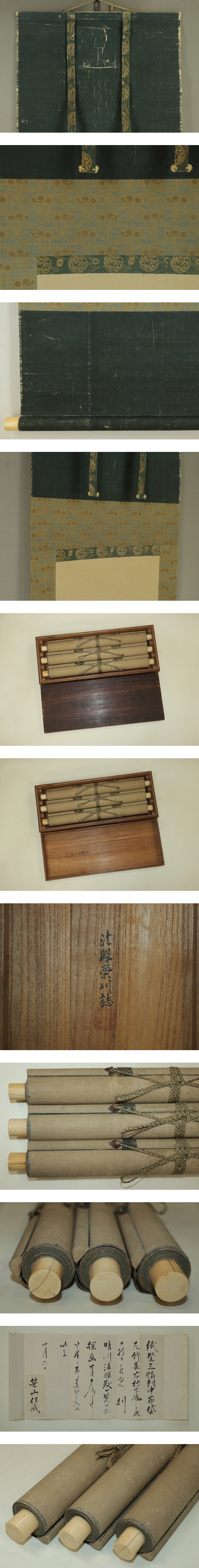 狩野探幽 かのう-たんゆう(1602-1674) 江戸前期の画家。鍛冶橋狩野派の祖。孝信の長男、尚信・安信の兄。 幼名は釆女、通称は守信、別号に白蓮子・生明等。 狩野派に新風をもたらし、同派中興の祖と仰がれた。 のち法眼に叙せられ、探幽斎と名のる。延宝2年(1674)歿、73才。 本紙は、染み、汚れ、折れ、皺、擦れがあります。 表装は、染み、汚れ、折れ、皺、虫食い、破れ、ほつれ、生地剥れ、 軸先に汚れとヒビがあります。 【サイズ】 作品 横約28cm×縦約97cm 表装 横約39.5cm×縦約181cm |