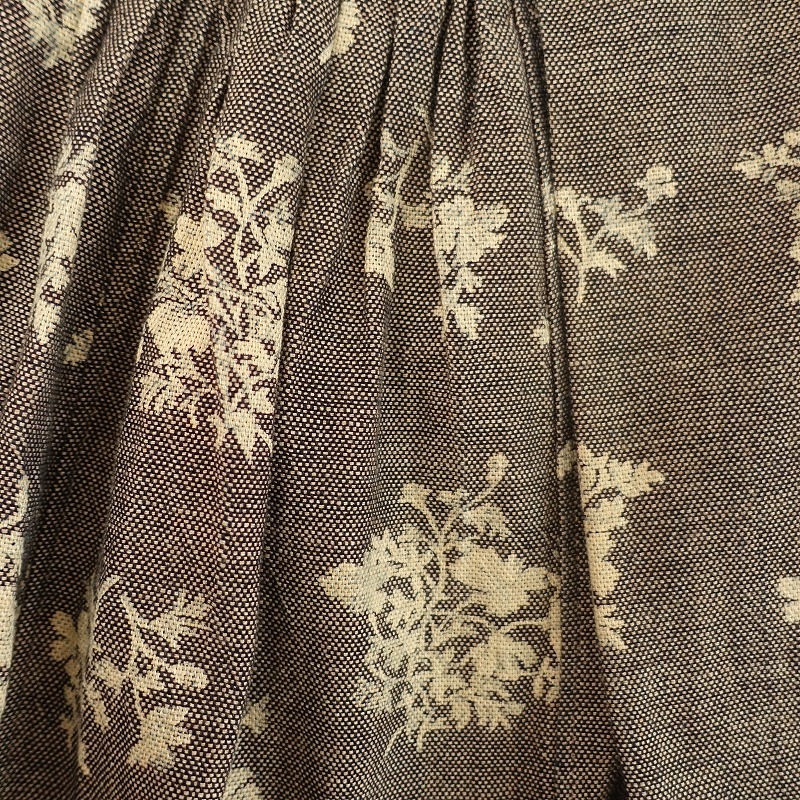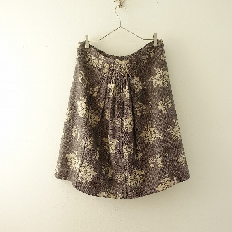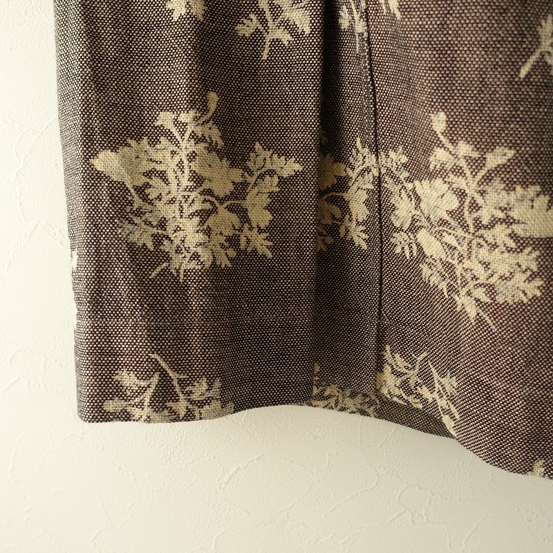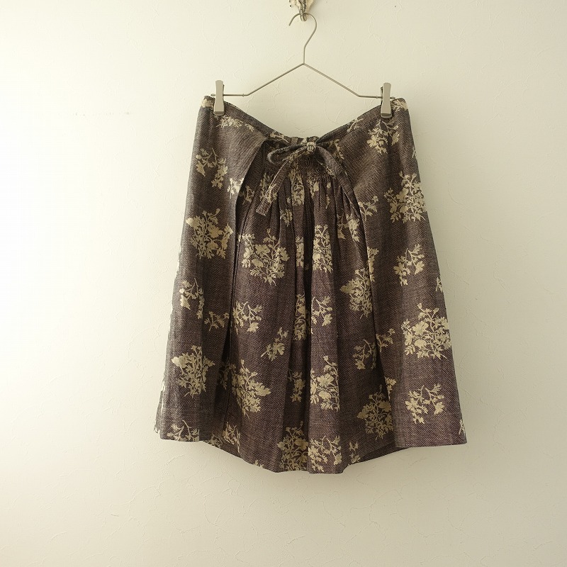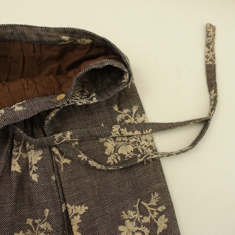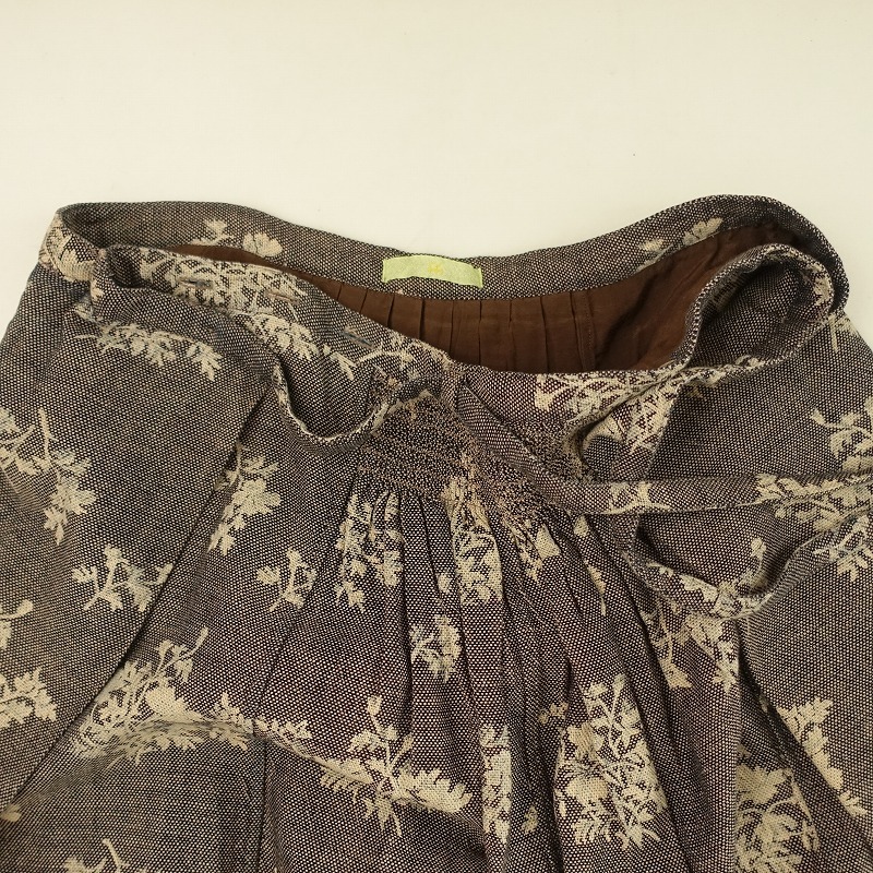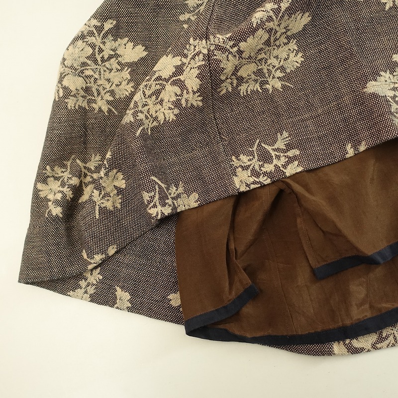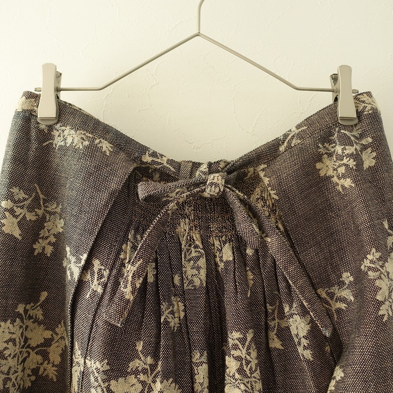 | R45RPMの総柄フロントラップリボンギャザースカートです。カラーは黒×ベージュ・セージグリーンです。ドライな麻のような質感のオックス風の織り生地を使用。綿とシルクの裏地付きで仕立てられています。筒状のスカートで、前後センターには糸シャーリングを配したギャザー入り。サイドの比翼部分はフロントのアジャストボタン留めで、ウエストの調節が可能です。ポケットはございません。 |