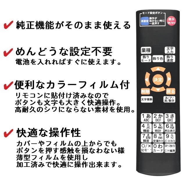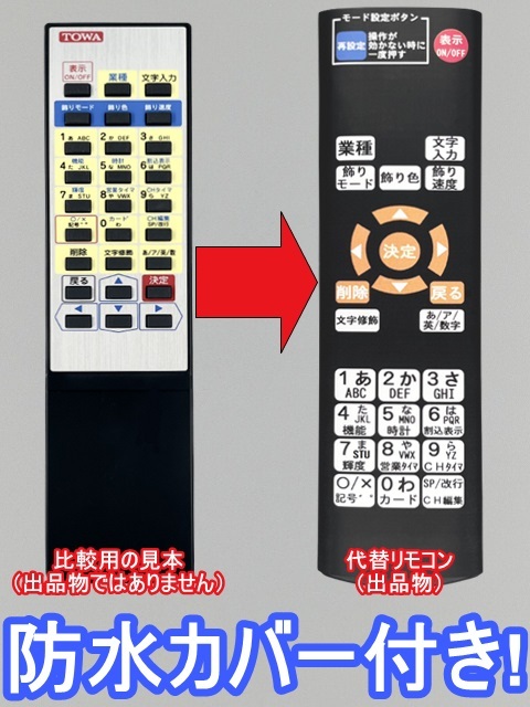 | 【商品名】 TOWA TM-11R-1 US-11R-1 代替リモコン 【対応機種】 FS-01W FS-01S TM-1000 TM-F1000 TM-1050 TMK-450 TMK-650W TMK-650S TMK-FL400W TMK-FL400STMK-FL600W TMK-FL600S TMK-G400W TMK-G400S TMK-G600W TMK-G600S TMK-L450 TMK-L650W TMK-L650S TMK-YFL400 TMK-YL450 TMK-YL650W TMK-YL650S TMK-YL1050W TMK-YL1050S US-SD31W US-RSD31W US-WSD31W US-WFP01W US-WFP01S US-WFP04W US-WFP04S US-WFP06W US-WFP06S US-W3510W US-3510S US-Y5100W US-Y5100S US-Y4510W US-Y4510S US-Y6510W US-Y6510S US-YFP01W US-YFP01S US-YFP04W US-YFP04S US-YFP06W US-YFP06S US-YLP4000W US-YLP4000S US-YLP6000W US-YLP6000S US-YSD31W US-YZD31S 等用 上記機種以外については、質問欄よりメーカーと型番をご連絡頂ければ、対応品のご案内をしております。 【商品について】 右側の代替リモコンが出品物になります。左側のリモコンは見本画像です。 タイトル機種のリモコン信号を入力した、設定不要で使える純正品と同等の代替リモコンです。 商品に不具合があった場合は代替品交換かご返金にて対応させて頂きます。 【付属品について】 防水リモコンカバーをお付けします。 ボタン機能を印刷した薄型フィルムはリモコンに貼付け済みです。 乾電池は付属しません。別途ご用意下さい。(単4乾電池×2本) 看板の設定のご説明や取り扱い説明書のご用意は出来ません。ご了承下さい。 【発送について】送料無料 迅速発送を心掛けております。土日祝日はお時間を頂く場合ございます。 ポスト投函配達となり、日時指定は出来ません。 | ||