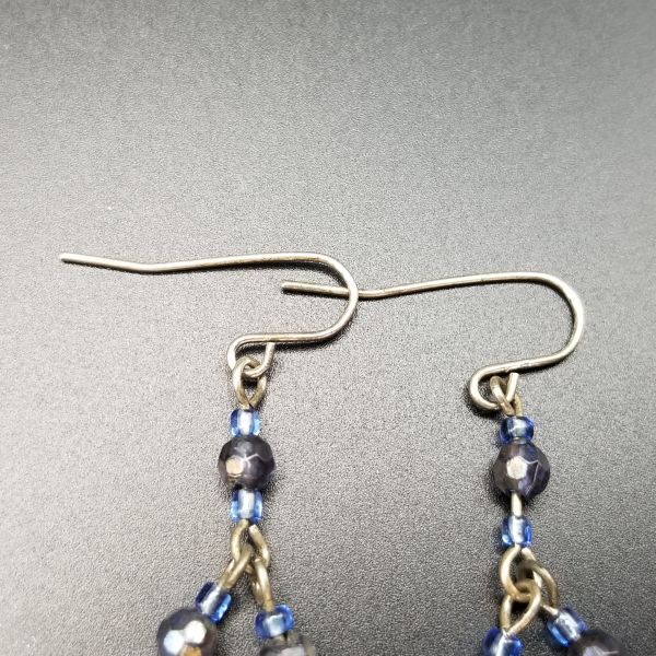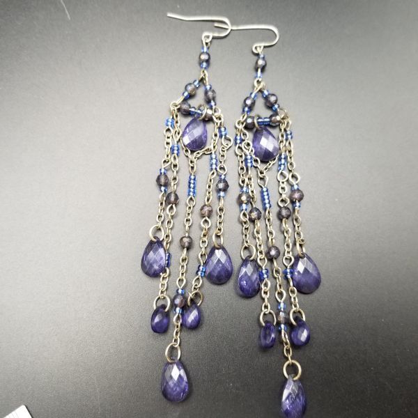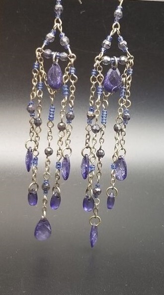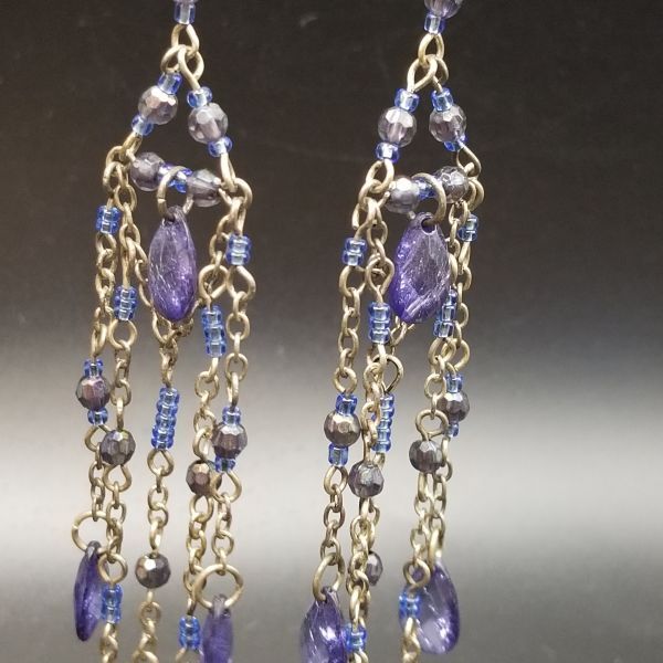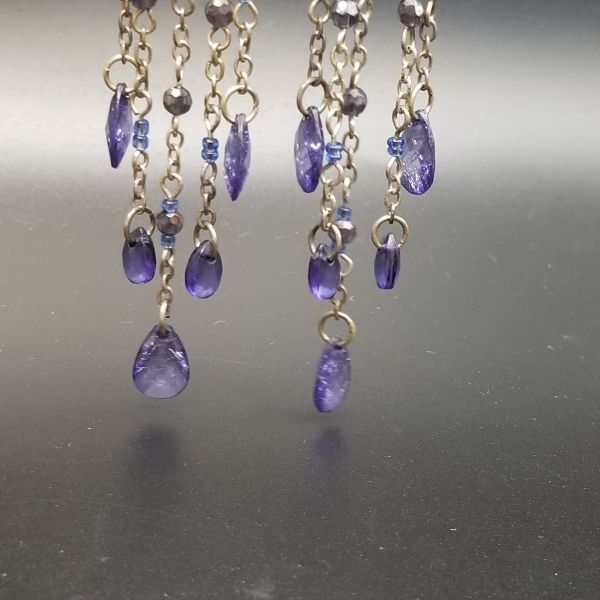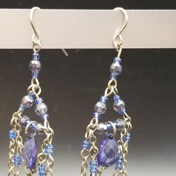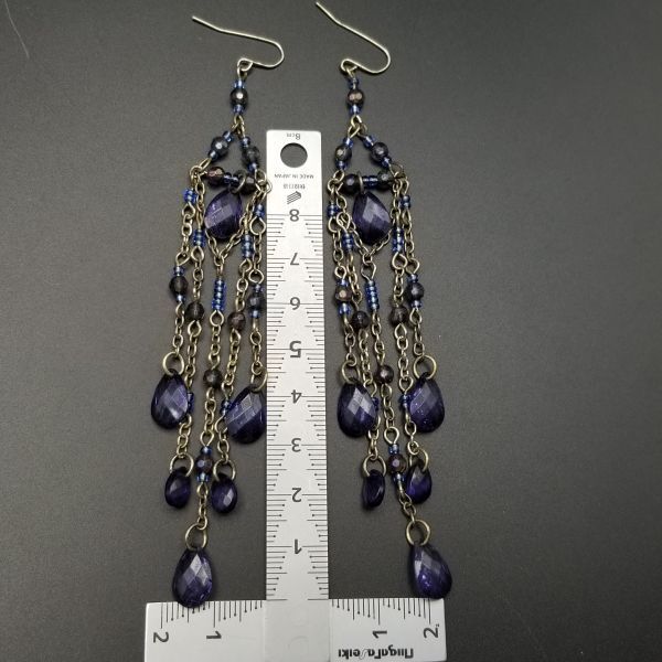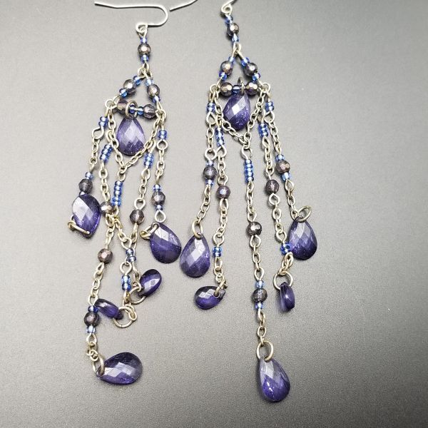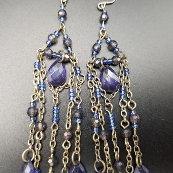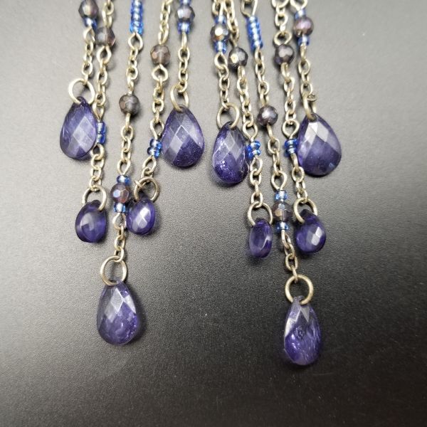 タンザナイトカラー ロングチャーム ヴィンテージ フックピアス シルバートーン チェーンリンク ラインストーン装飾 エレガント 華やか AJI