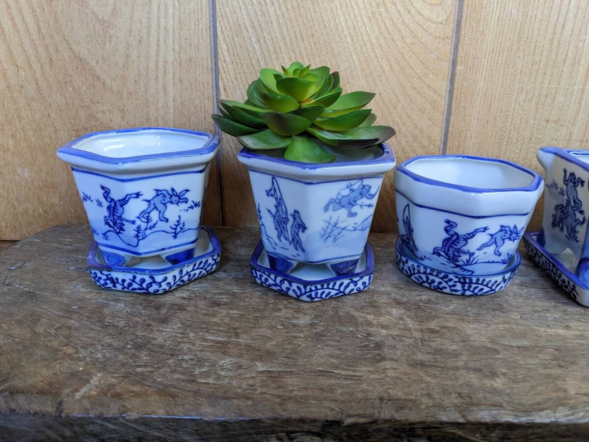 【受け皿 下皿・・・蛸唐草】 蛸の音を「多幸」とかけ、縁起の良い文様としても重宝されています。 唐草文様. つる草が四方八方に伸びてからみあう文様です。 どこまでも伸びていくツタの様子は、まさに生命力の象徴。 一族の繁栄や長寿を意味する、縁起がよい吉祥文様として愛されています。 ミニ盆栽や多肉植物、サボテンや苔玉、ミニ観葉植物など小さな植物の鉢カバーとして可愛いです。