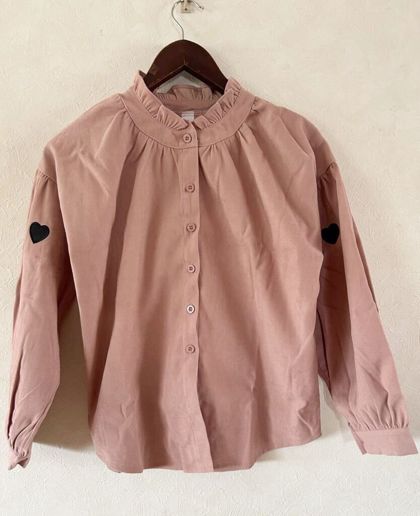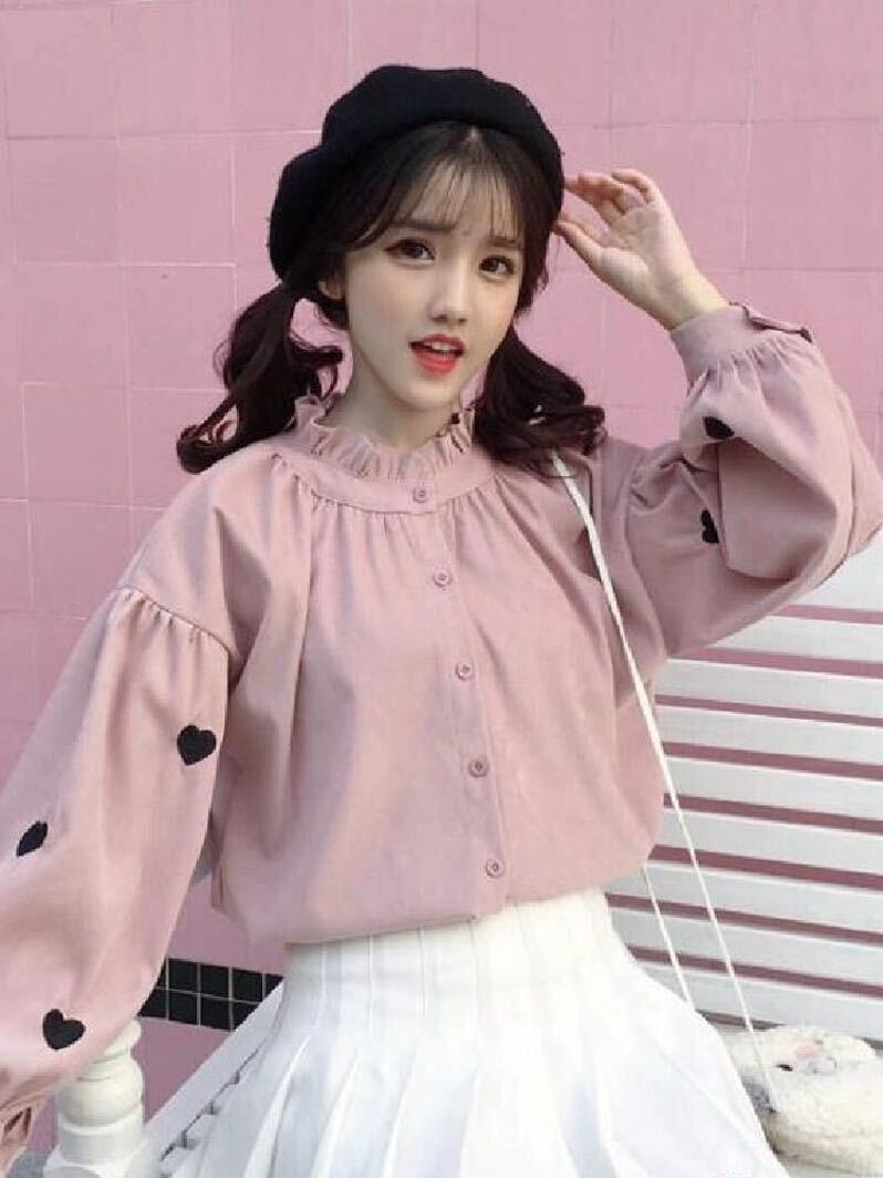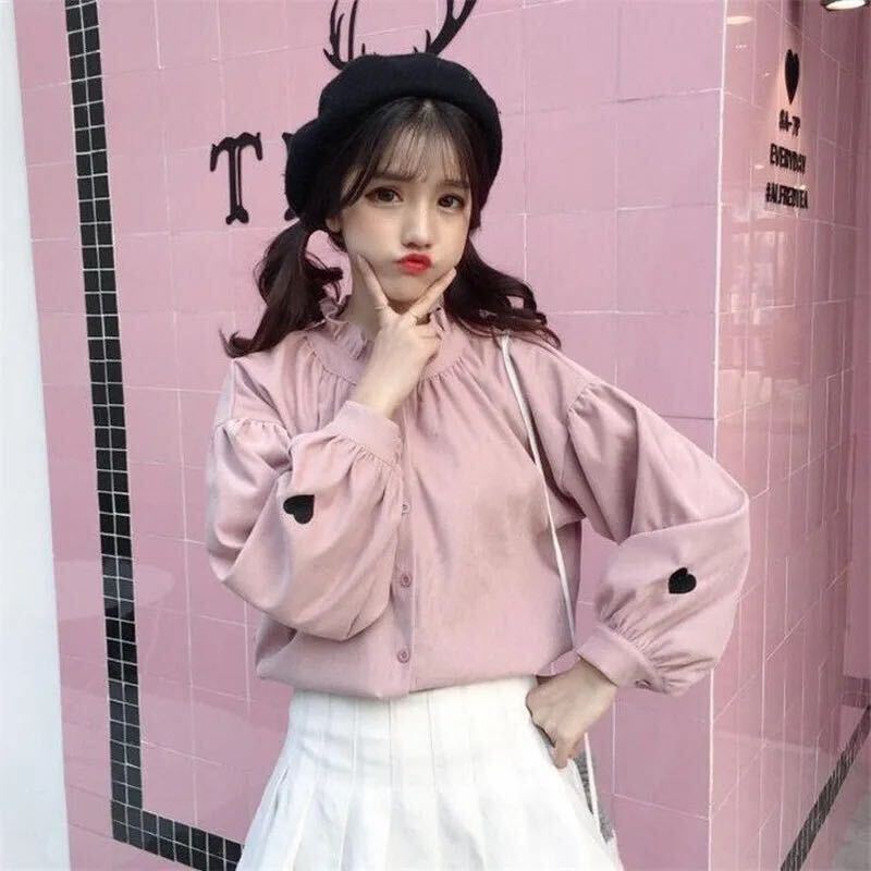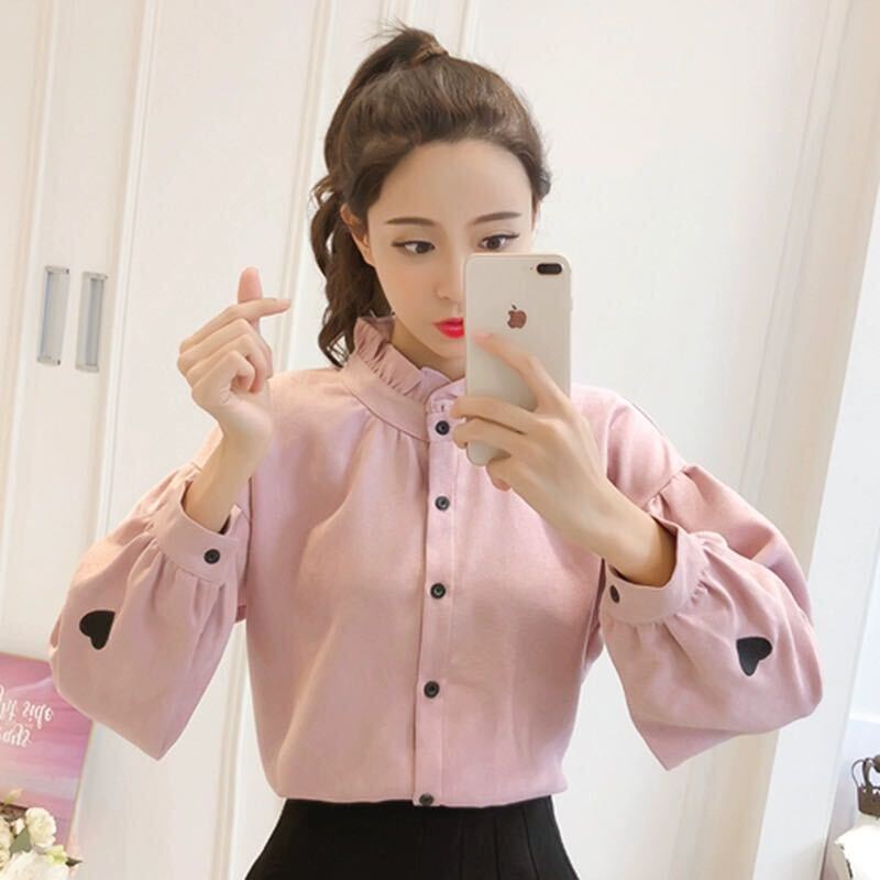 長袖ボタンダウンブラウス,ハート型のプリントが施されたかわいいトップス,韓国風,