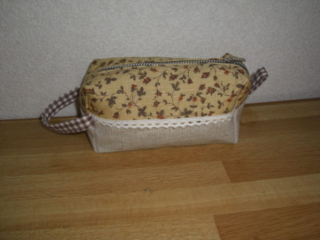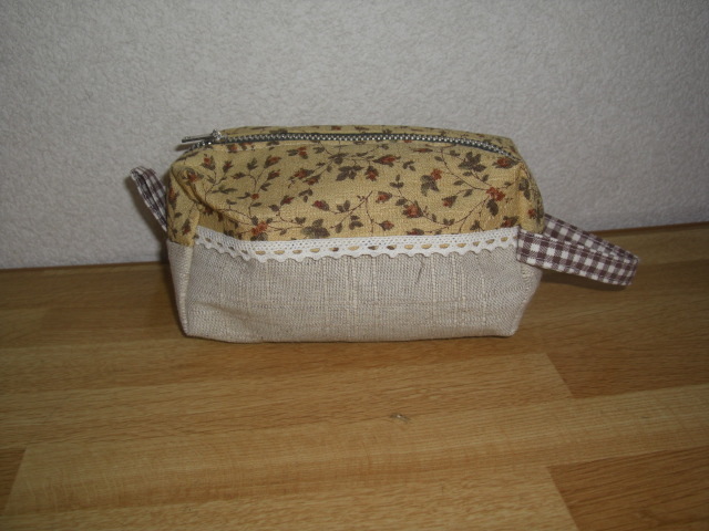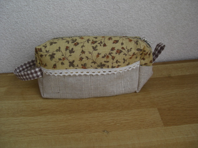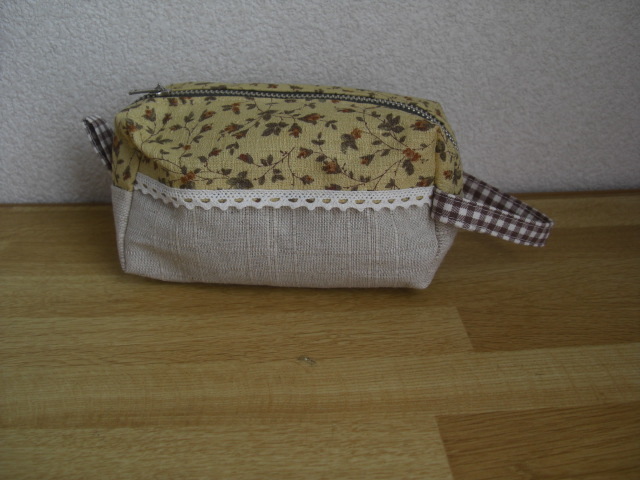 黄土色に植物柄&サンドベージュの格子ライン入り無地コットンポーチ。表地に接着芯を貼っただけで裏地はありません。サイズはおよそですが横14㎝、縦8㎝、マチ6cm。端末によって実物と色が違って見える可能性があることをご了承ください。素人の手作りですのでゆがみなど不備があるかもしれませんがご理解いただける方よろしくお願いいたします。
