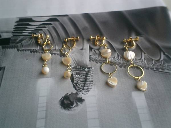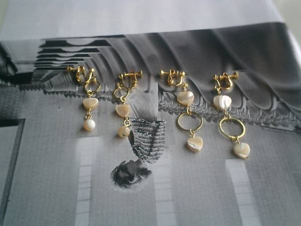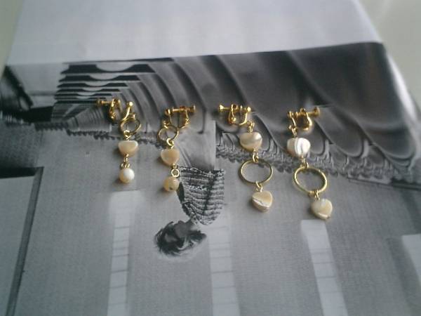 女の子的ディテール・・シリーズです♪ベージュ色のハート・・シックなマザーオブパールのイヤリング2組です♪♪デザイン違いのペア2組です♪8ミリから10ミリ位の丸玉やハートなど大きさ違い、デザイン違いのマザーオブパールはデザインリングを合わせてキュートモダンしています♪長さは左のペアが5センチ、右側のペアが6センチ位です♪ピアスにも変更出来ます♪それぞれ単品でも出品しています♪お揃いのネックレスやブレスレットも出品しています♪♪ハンドメイドをご理解いただいてノークレーム・ノーリターンでお願いします♪