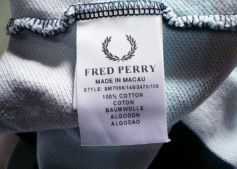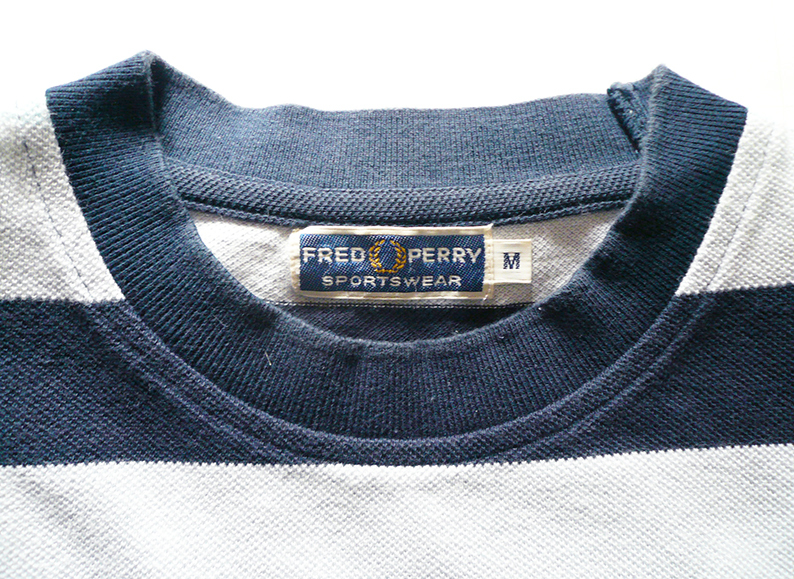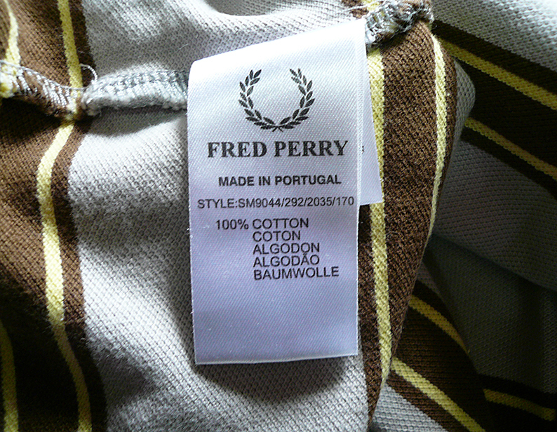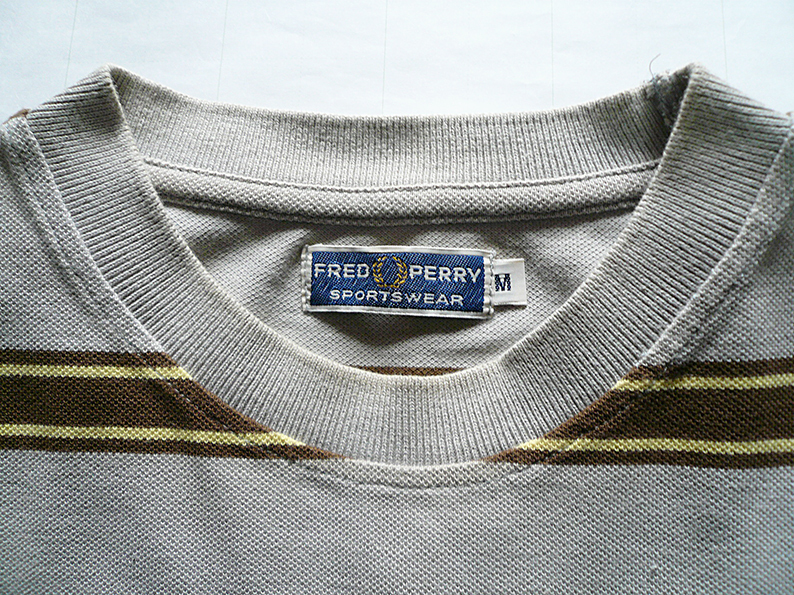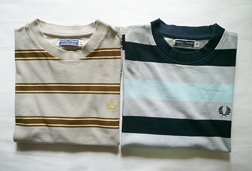 フレッドペリー ポルトガル製(グレー・ブラウン・イエロー系のボーダー)とマカオ製(紺・ブルー・グレーのボーダー)。素材はコットン100%です。2着セットとなります。