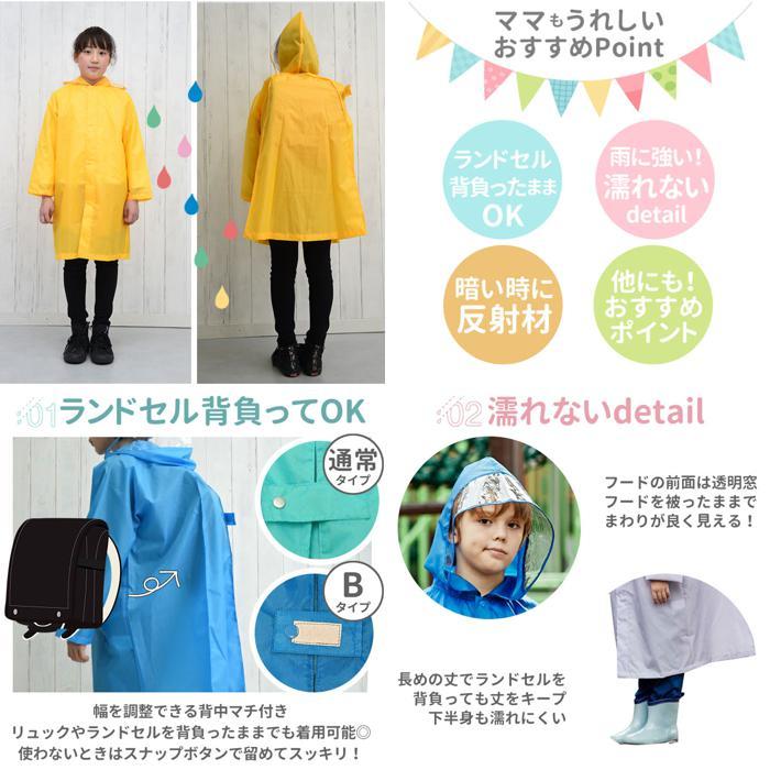 | 商品説明 | ・・虹をイメージした豊富なカラー展開と、実用性抜群の機能をご紹介します。 1.フードには透明ひさし付で、視界良好。 2.ポケットにはフラップ(ふた)が付いていて雨水がレインコートを伝ってポケットに入るのを軽減します。 3.背中マチ付きでランドセルやリュックの上からでもゆったり着用して頂けます。 4.前ポケット・背中タブ部分に反射材を採用。 5.ランドセルにそのまま取り付けられる、収納袋付き。 など、充実の機能が沢山。機能面も充実で色違いで揃えたくなるとご好評頂いているランドセルコートです。 |