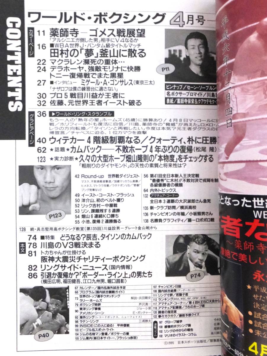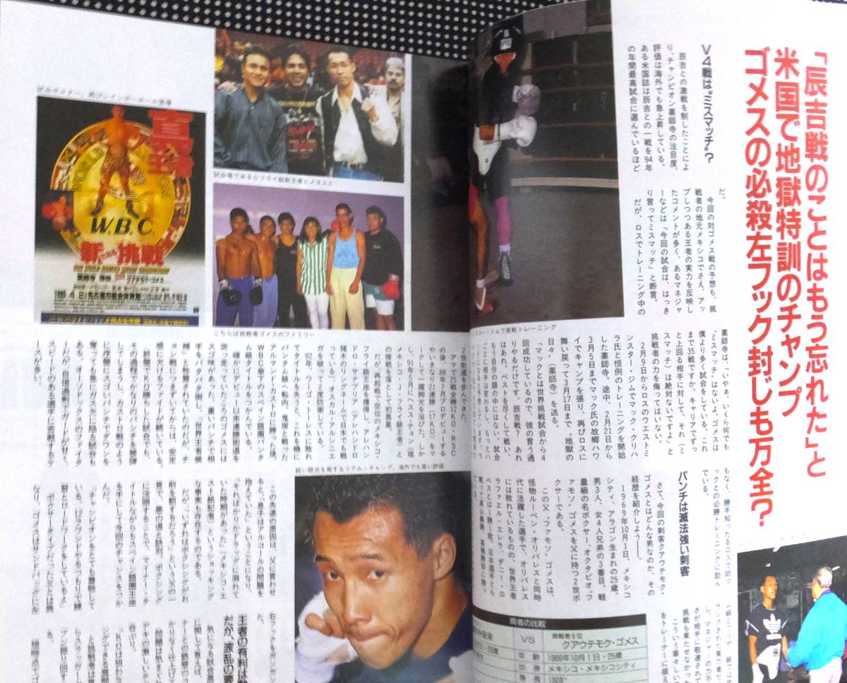 辰吉 丈一郎 に勝利して注目されていた、 薬師寺 保栄 の世界タイトル防衛戦展望記事がメインで、他では後の2階級世界チャンピオンとなる 畑山 隆則 や