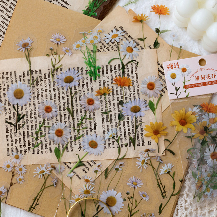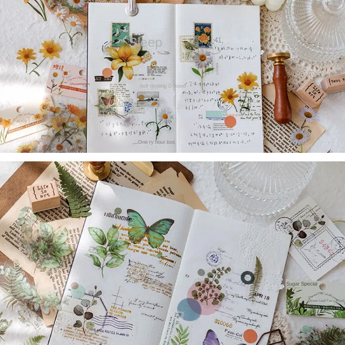 40枚 シール 花 フラワー 押し花 きのこ 透明 アンティーク ビンテージ デコステッカー アンティーク調 コラージュ レトロ 0735-5