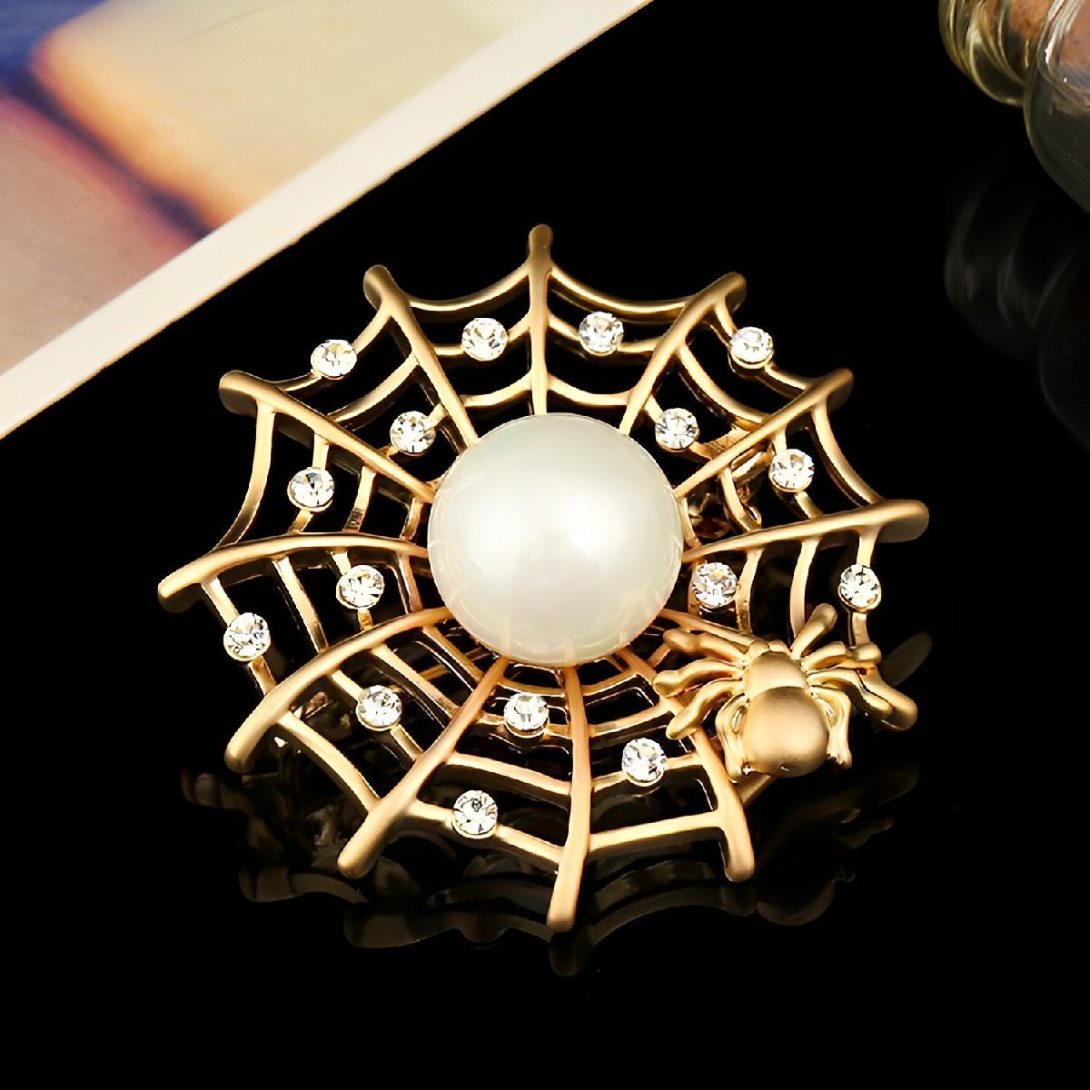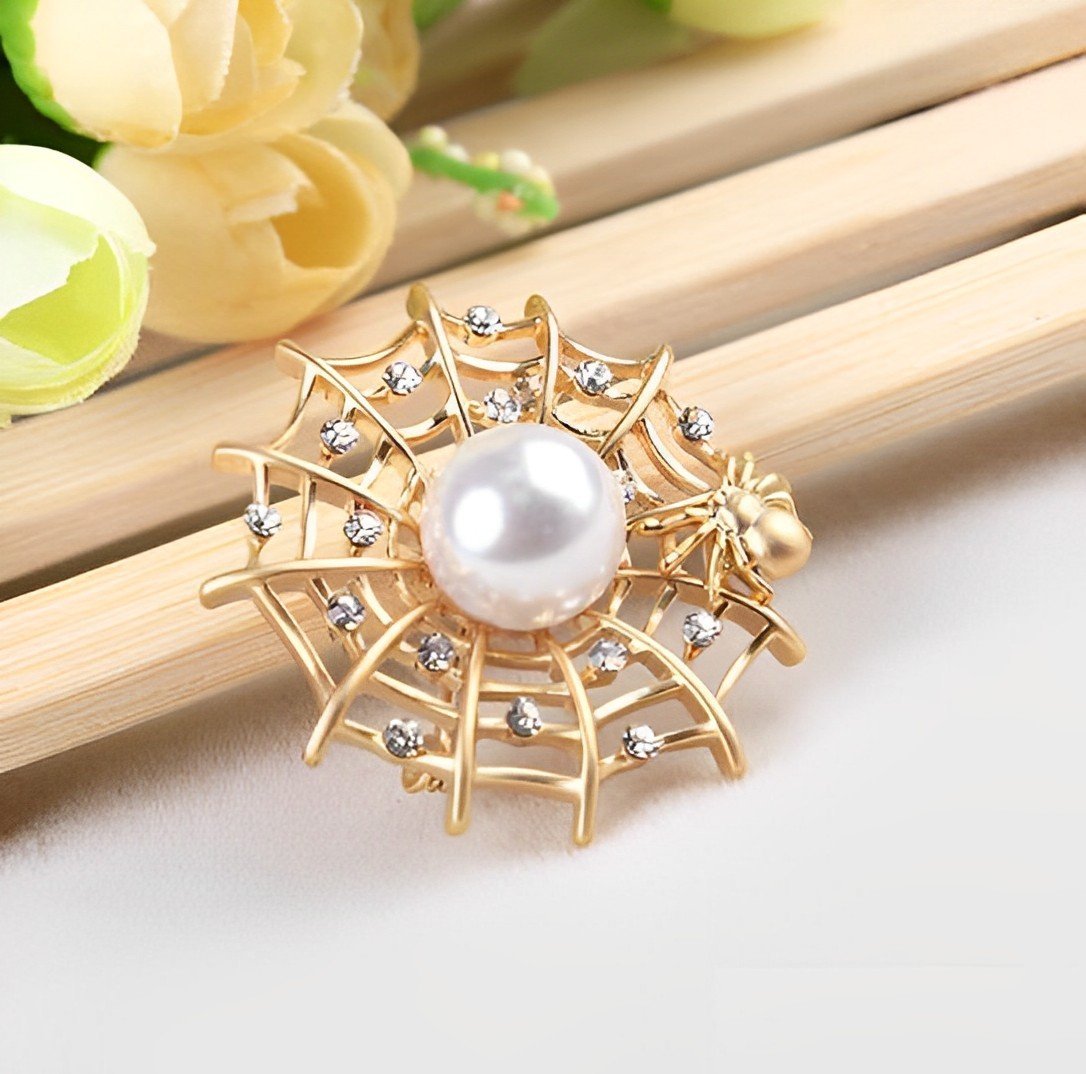 パール 蜘蛛巣 クモ ブローチ/ゴールド