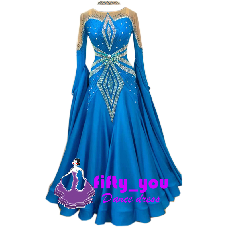 新品fifty_you セミオーダードレス レディース社交ダンス衣装 高級品 競技発表用ダンスドレス  ワルツドレス ライトストーン付 ブルー