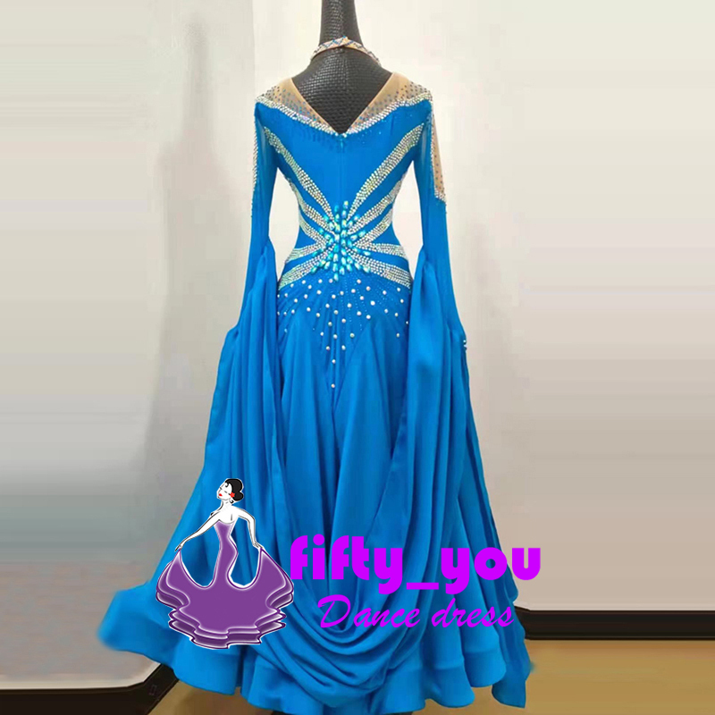 新品fifty_you セミオーダードレス レディース社交ダンス衣装 高級品 競技発表用ダンスドレス  ワルツドレス ライトストーン付 ブルー