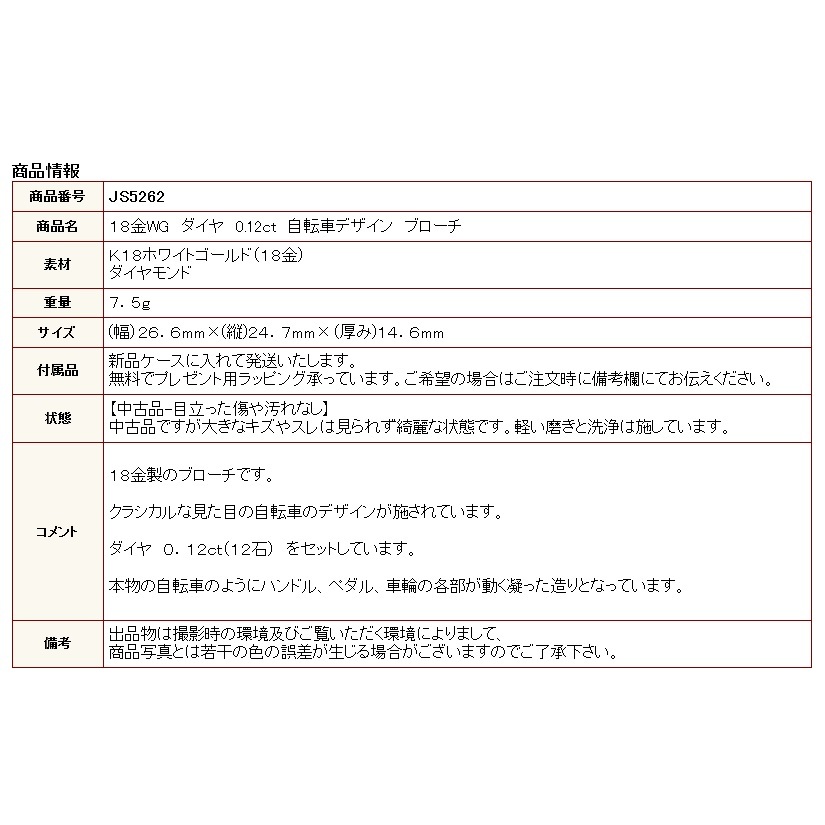 | 商品名 | 18金WG ダイヤ 0.12ct 自転車デザイン ブローチ |