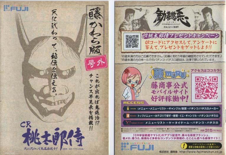 藤商事(FUJI)の2009年導入のパチンコ台「CR桃太郎侍天に代わって鬼退治致す!」の藤かわら版号外です。
