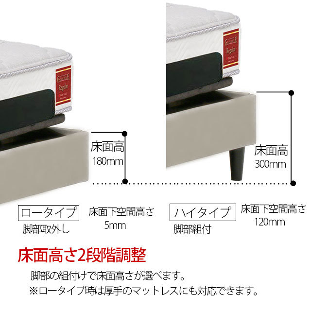 | ベッド外寸:幅101cm x 長さ214.5cm x 高さ:ロータイプ時74cm/ハイタイプ時86cm (床面高:ロータイプ時18cm/ハイタイプ時30cm) ポケットコイルマットレス(ブラック):幅97cm x 長さ195cm x 高さ22cm |