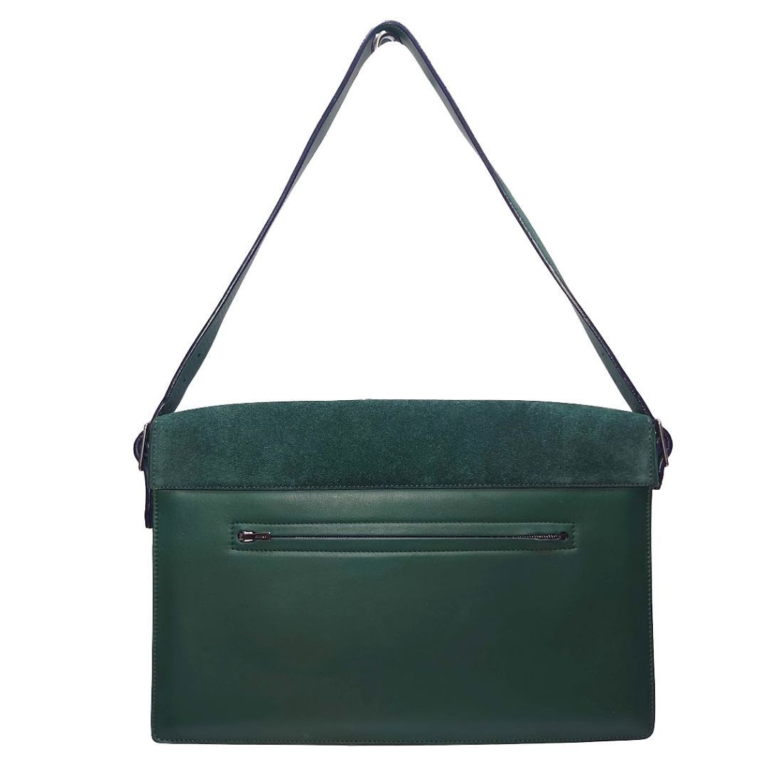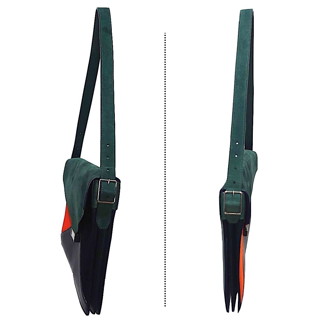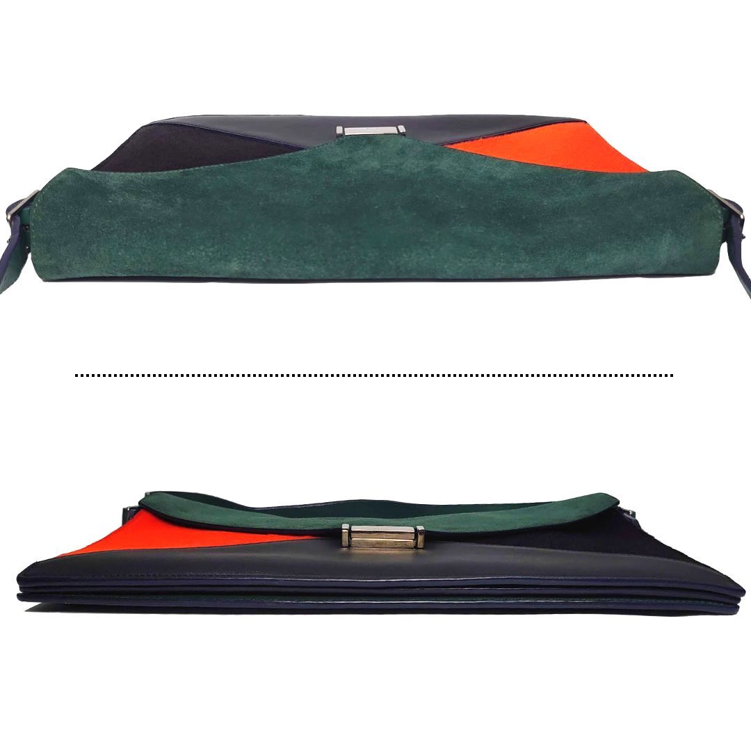 ◎グリーンのスエード、オレンジとブラックのハラコ、ブラックレザーの組み合わせがカラフルな2WAYバッグです。コバがネイビーにカラーリングされているのもポイント!グリーンの部分は、フラップ・ストラップがスエード生地、バッグ本体はレザー製です。