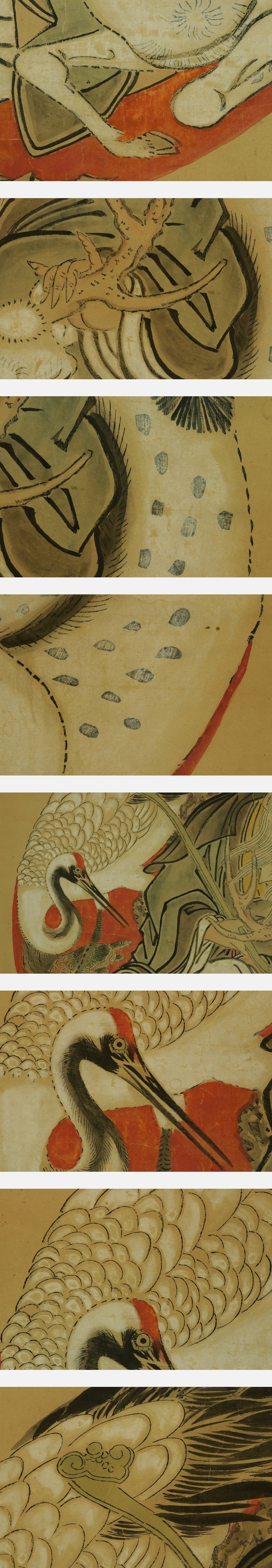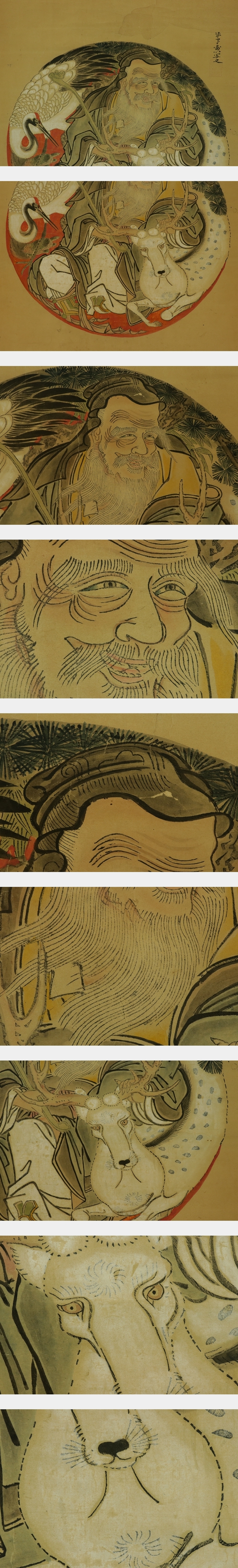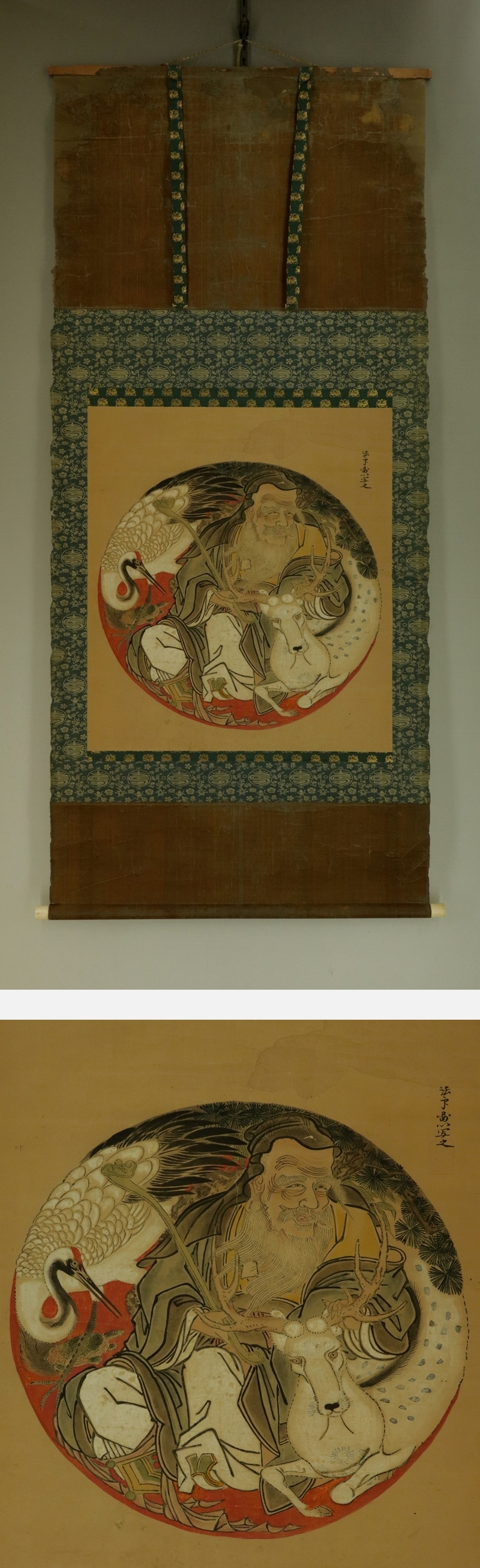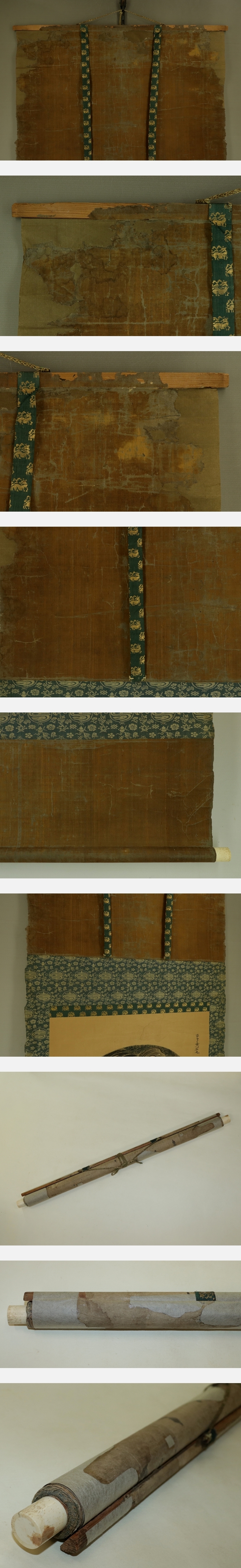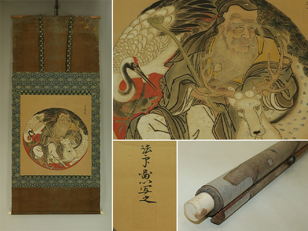 古画・在印【慶祝図】 本紙は、染み、汚れ、折れ、皺、擦れ、破れ、ヤケ、修理痕があります。 表装は、染み、汚れ、強い折れ、皺、擦れ、虫食い、破れ、ほつれ、剥れ、 時代感、軸先に汚れとヒビ、軸紐に劣化があります。 【サイズ】 作品 横約54cm×縦約61.5cm 表装 横約67cm×縦約151cm |