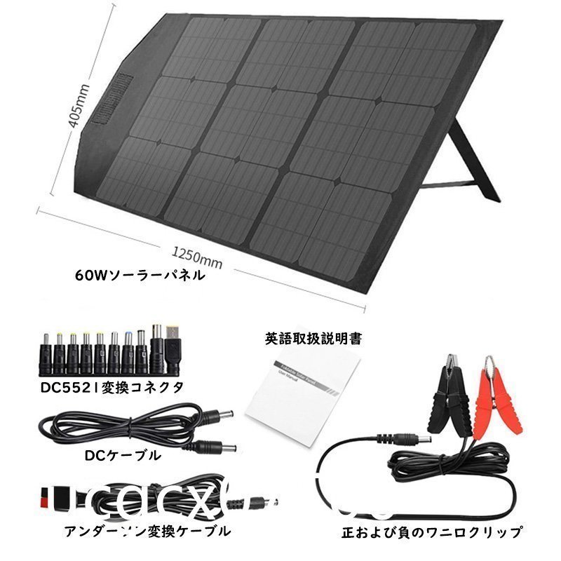 パッケージ内容:60Wソーラーパネル、DCケーブル、DC5521変換コネクタ、1xアンダーソン変換ケーブル、1x正および負のワニ口クリップ、1x英語取扱説明書