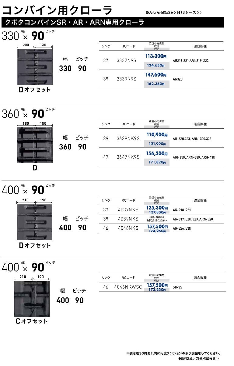 KBL クボタコンバイン用ゴムクローラ 3337N9S:幅 330xピッチ 90xリンク数 37 ※1本価格