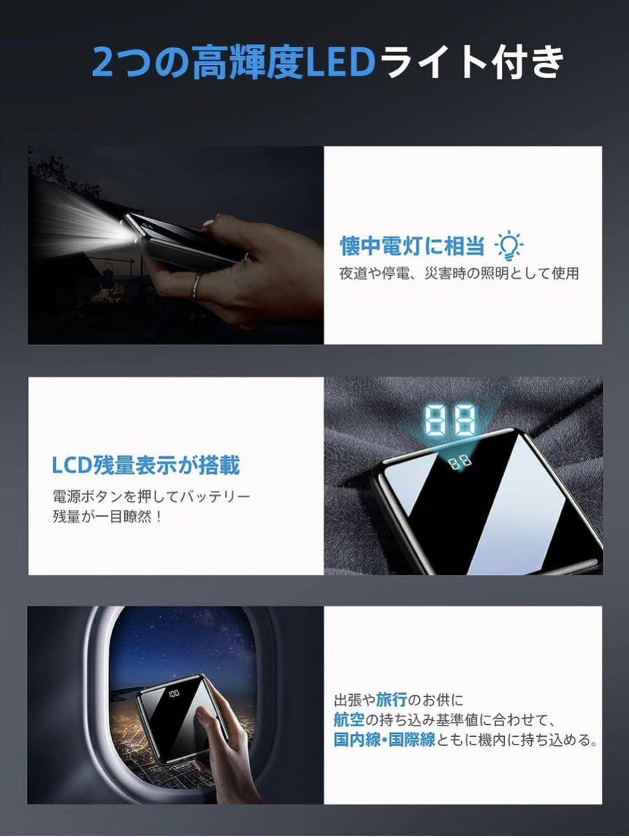 【高輝度LEDライト付き】こちらのモバイルバッテリーには、二個高輝度LEDランプが採用されています。電源ボタンを3秒長押しすると懐中電灯に変身、連続で約80時間点灯します、特に地震、災害、停電時などでも重宝します。高級素材を使用した、滑らかな質感のあるスタイリッシュなデザインになっています、プレゼントにもピッタリです。