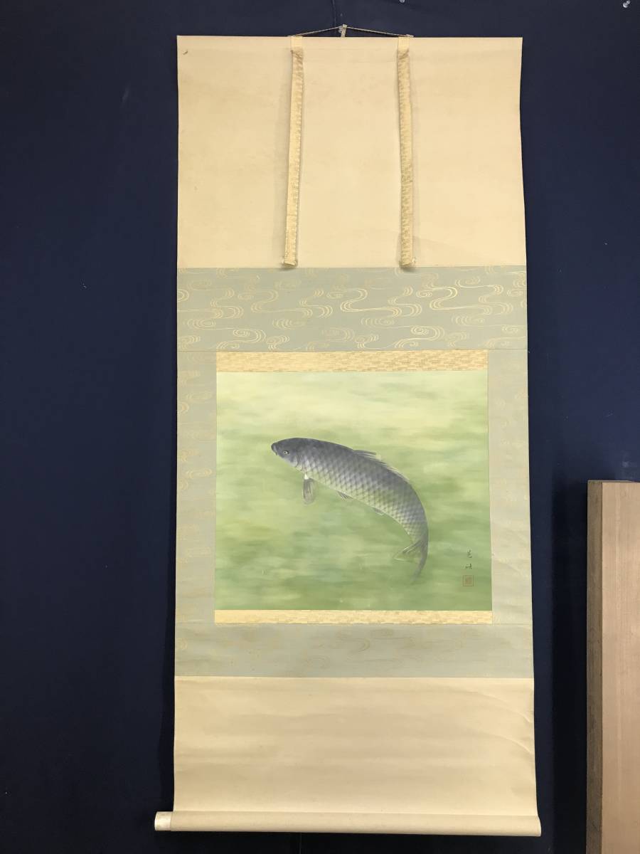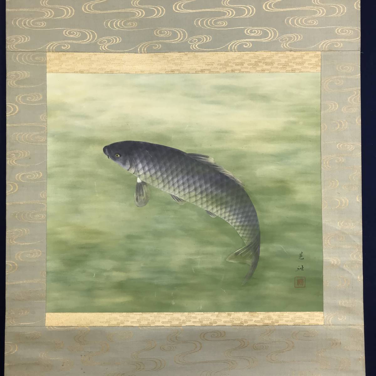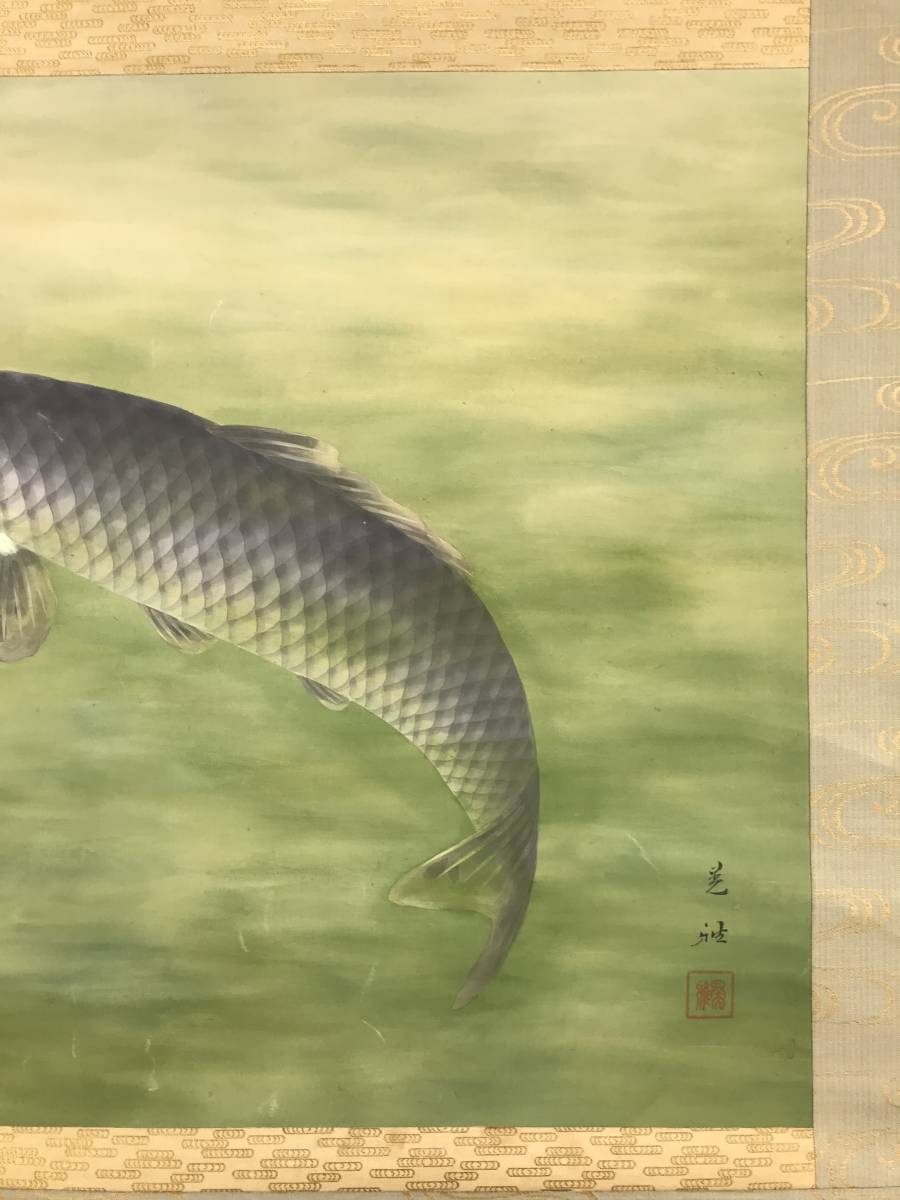 真作/羽田晃雅/鯉図/游鯉図/遊鯉図/コイ図//掛軸☆宝船☆AD-905